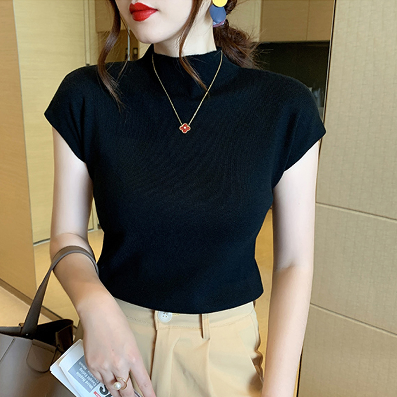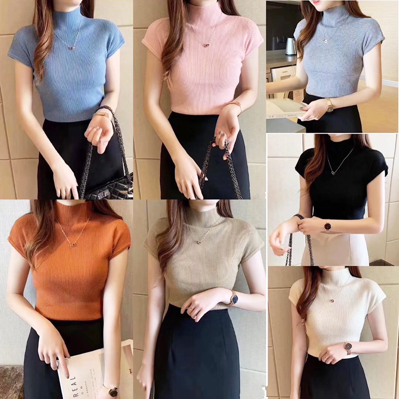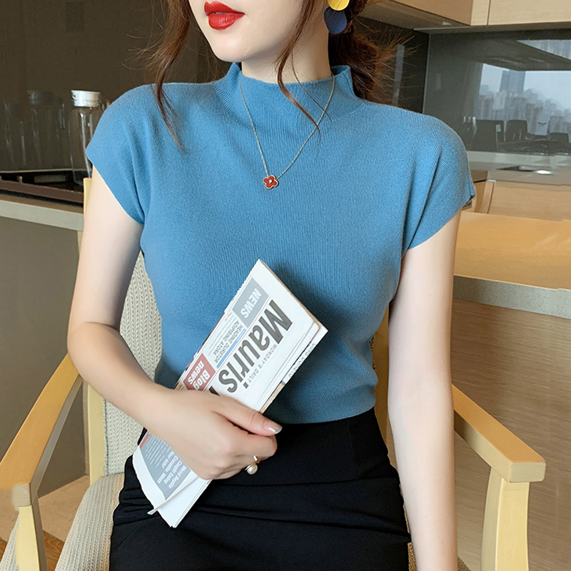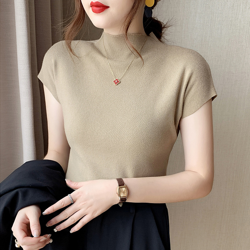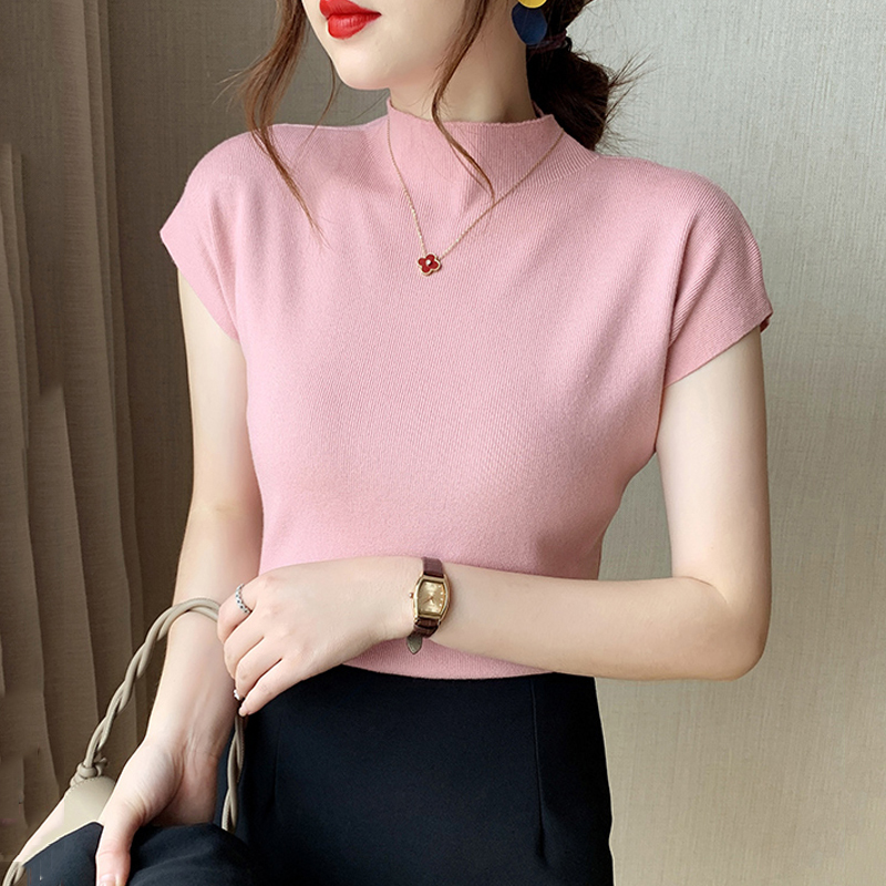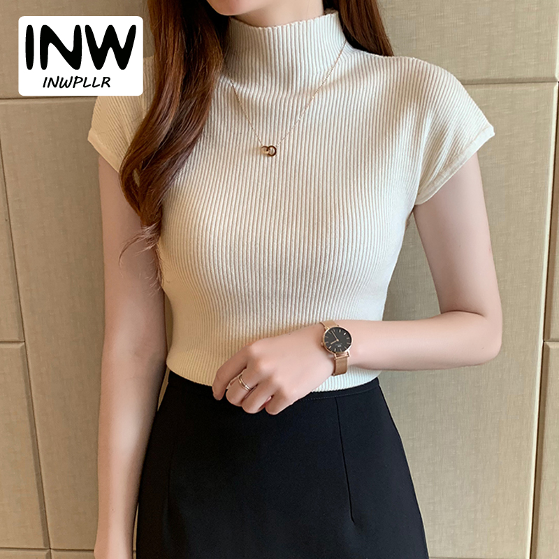 INWPLLR New Casual Women T-shirt Half Turtleneck Short Sleeve Plain Top Summer Slim Bottoming Knitted Tshirts Ladies