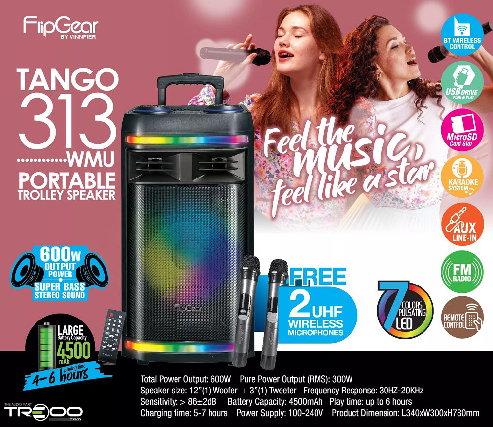 Vinnfier FlipGear Tango 313 WMU Wireless Bluetooth Trolley Portable Speaker with Wireless Handheld Microphones
