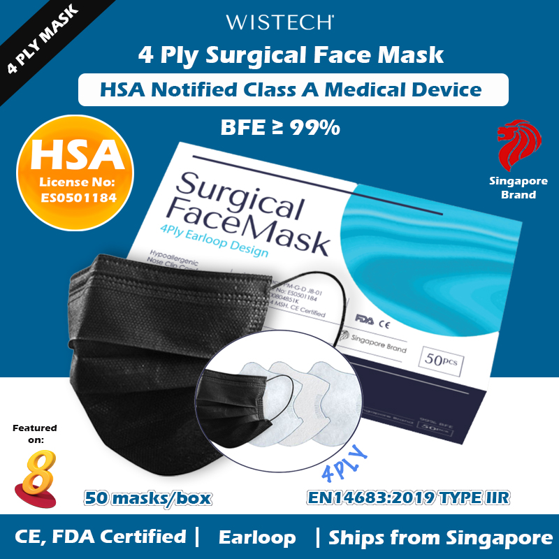 [OFFICIAL STORE] GET ADDITIONAL % OFF Wistech 4 Ply (Blue) Surgical Mask, 50 pieces, HSA Notified Medical Device, FDA CE Approved, BFE 99%, Wistech Singapore