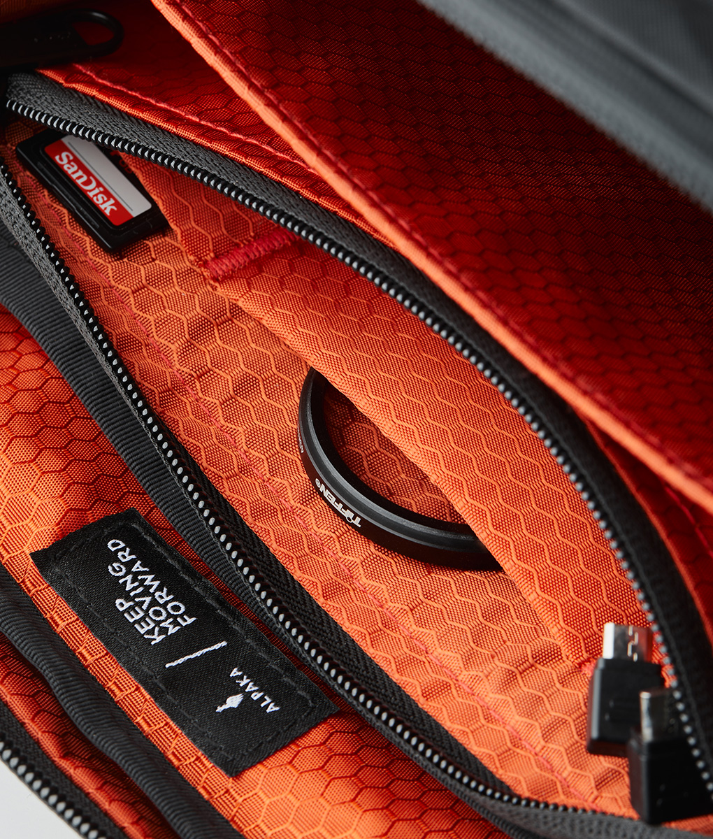 - Compartments are lined with Ripstop Nylon in Blood Orange