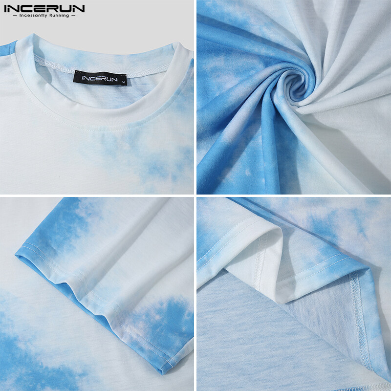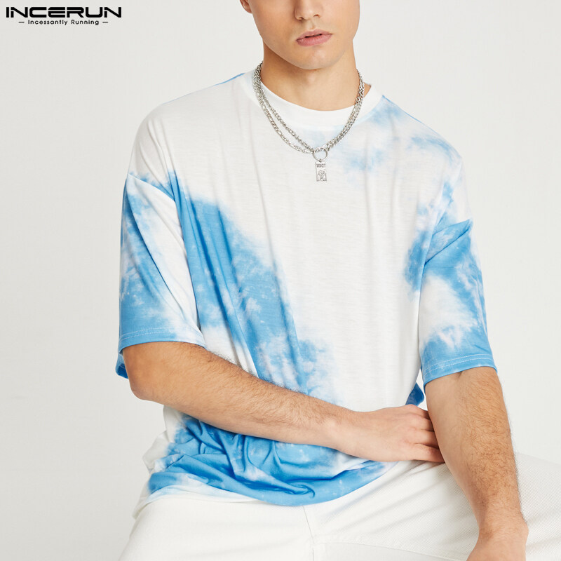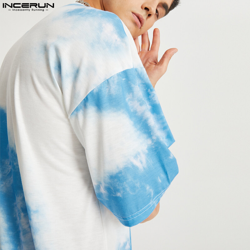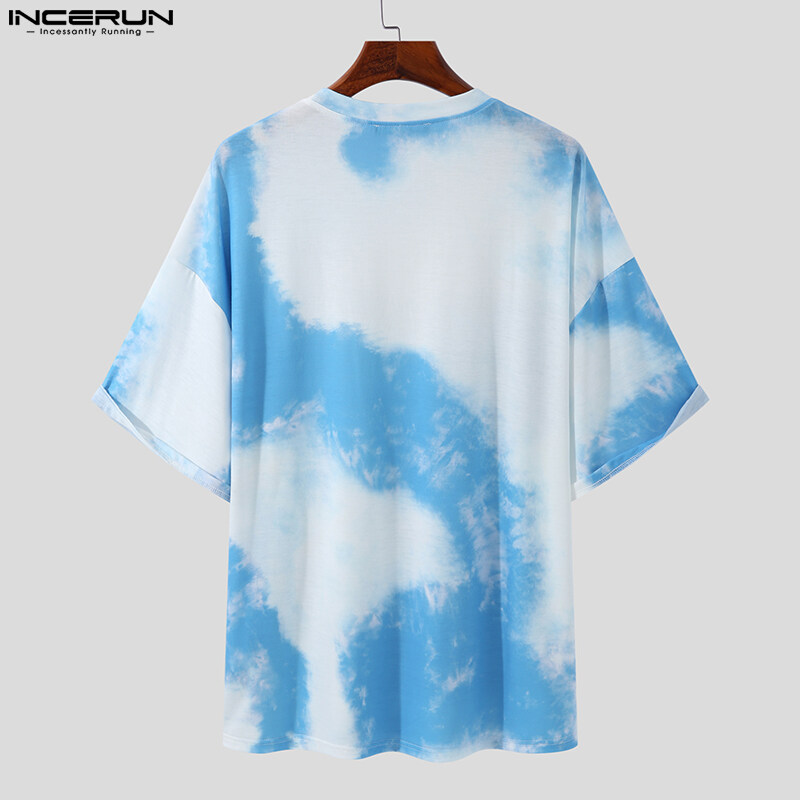 INCERUN Mens Tie Dye Blue Holiday Casual Short Sleeve T Shirt Loose Fit Crew Neck Tee Top (Western Style)