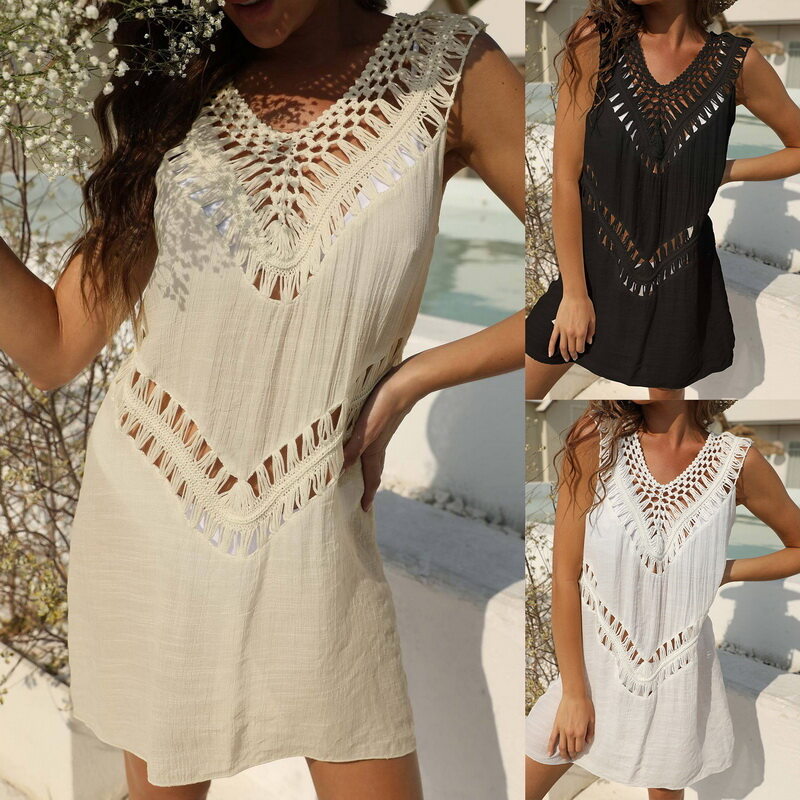 Adisputent Sexy Hollow Out Beach Dress Tunic Robe See Through Hollow Out Anti UV Cover Up Swimwear Beach Dress Female Bathing Vestidos