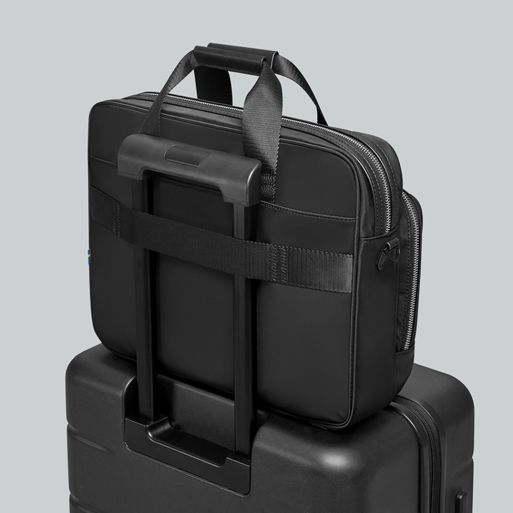 Constructed from recycled vegan leather, our Wörk briefcase is a sleek and durable option for the office. It fits a 16" laptop and has separate pockets to keep your documents organised. Use the adjustable and detachable strap — subtly woven with symbols referencing our Corporate Coast collection — or slip it over your luggage handle using the back strap.