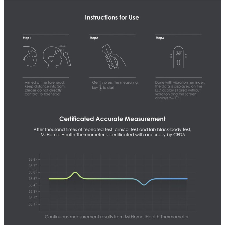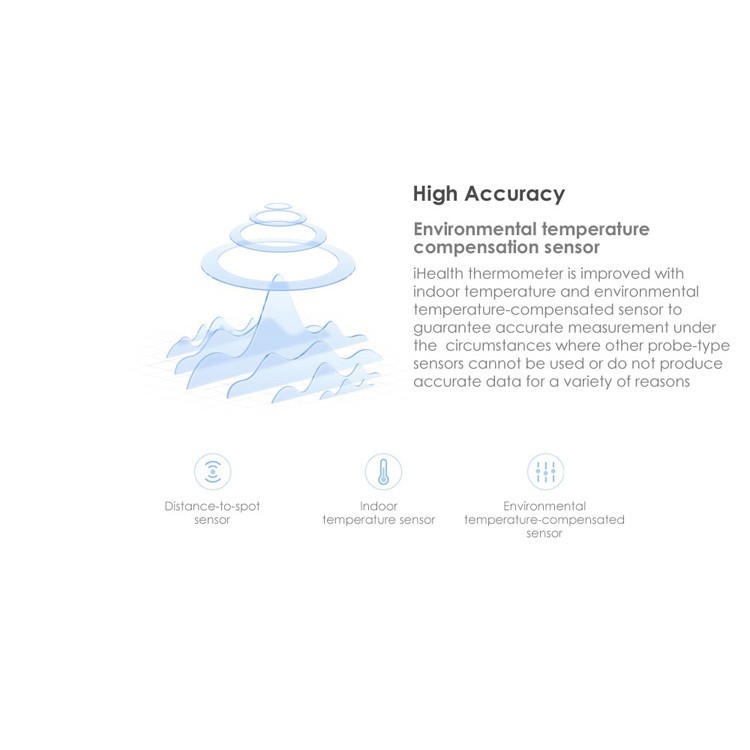 Featured with 1-second quick detection, non-contact infrared thermometer, advanced German Heimann Sensor, and clear LED digital display, this Mi Home iHealth thermometer will give you a more convenient, hygienic and accurate body temperature measurement. After one second measuring, there will be a noiseless vibration reminding to be done, more considerate to not disturb your sleeping baby.
