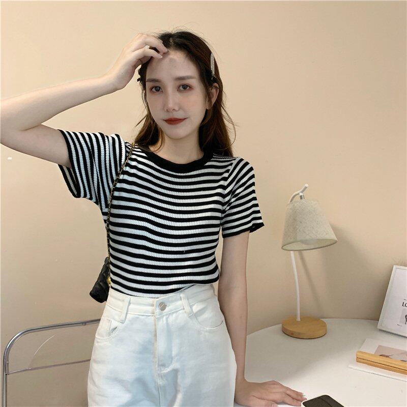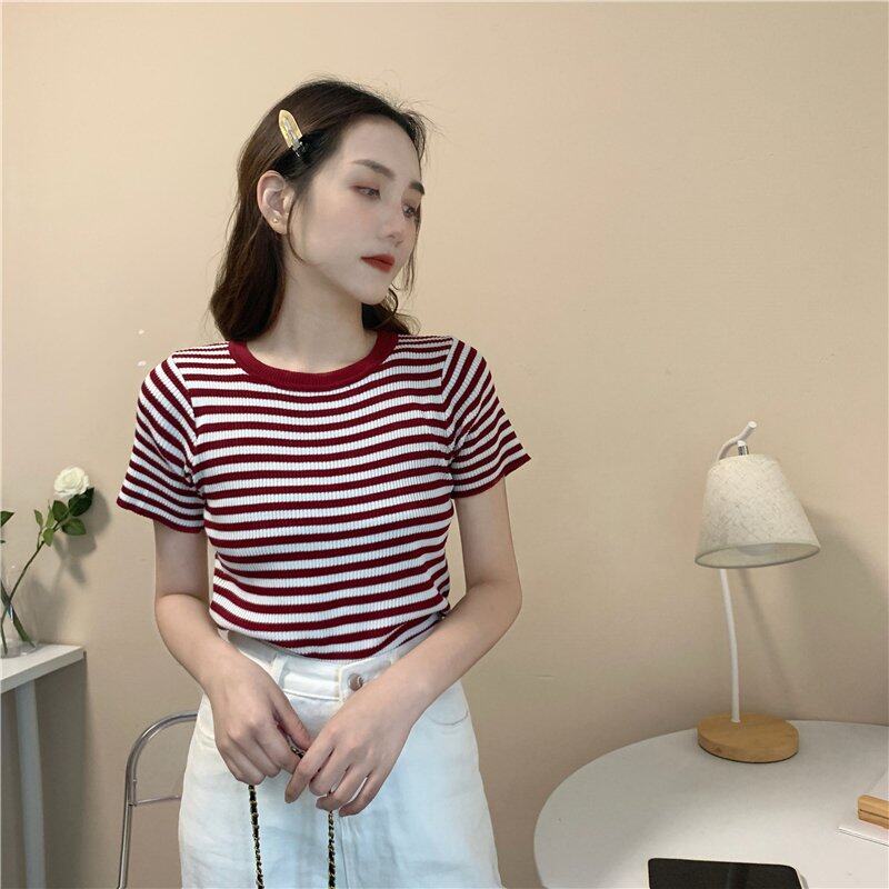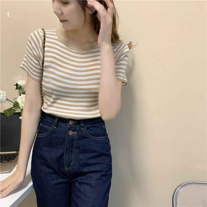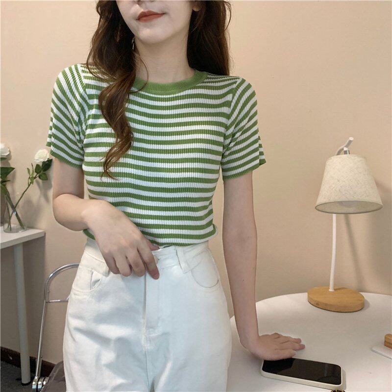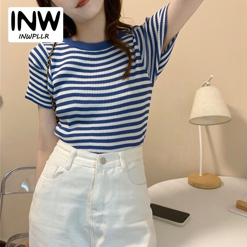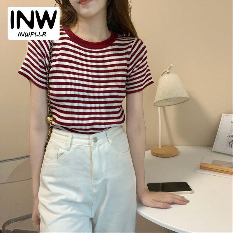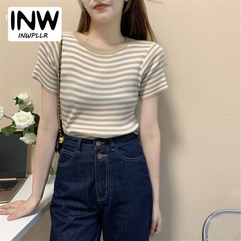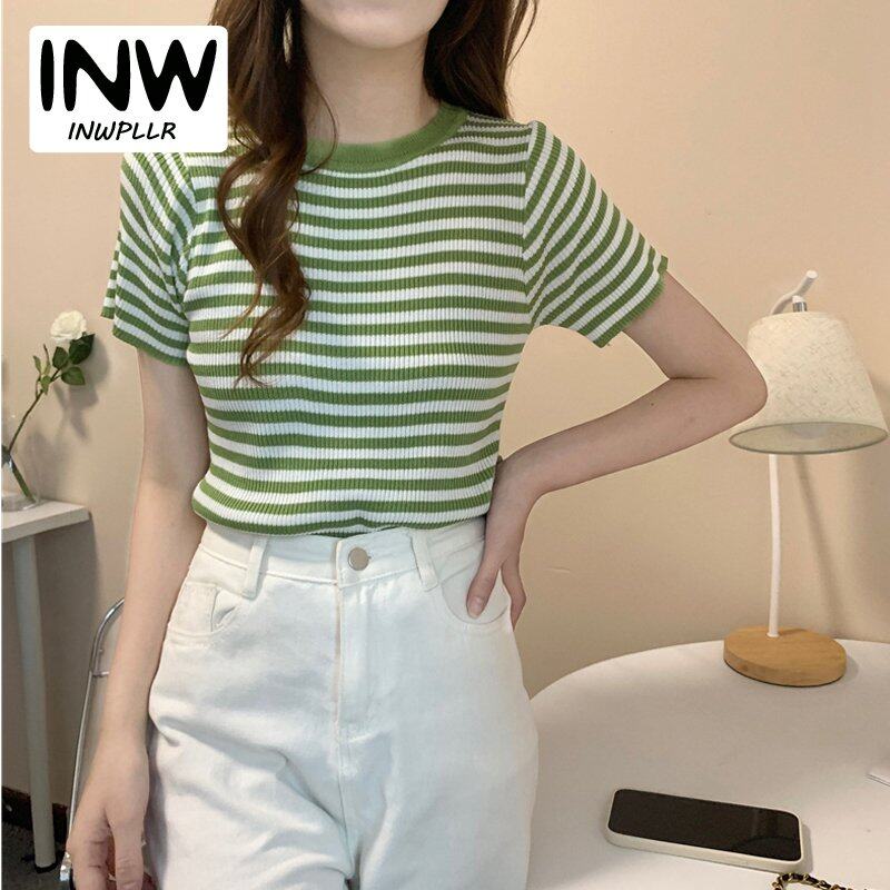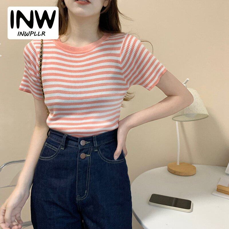 INWPLLR Fashion Trends Knitting T-shirts Ladies Lazy Style Multi Colors Stripe Tops Woman Casual Summer Tshirt