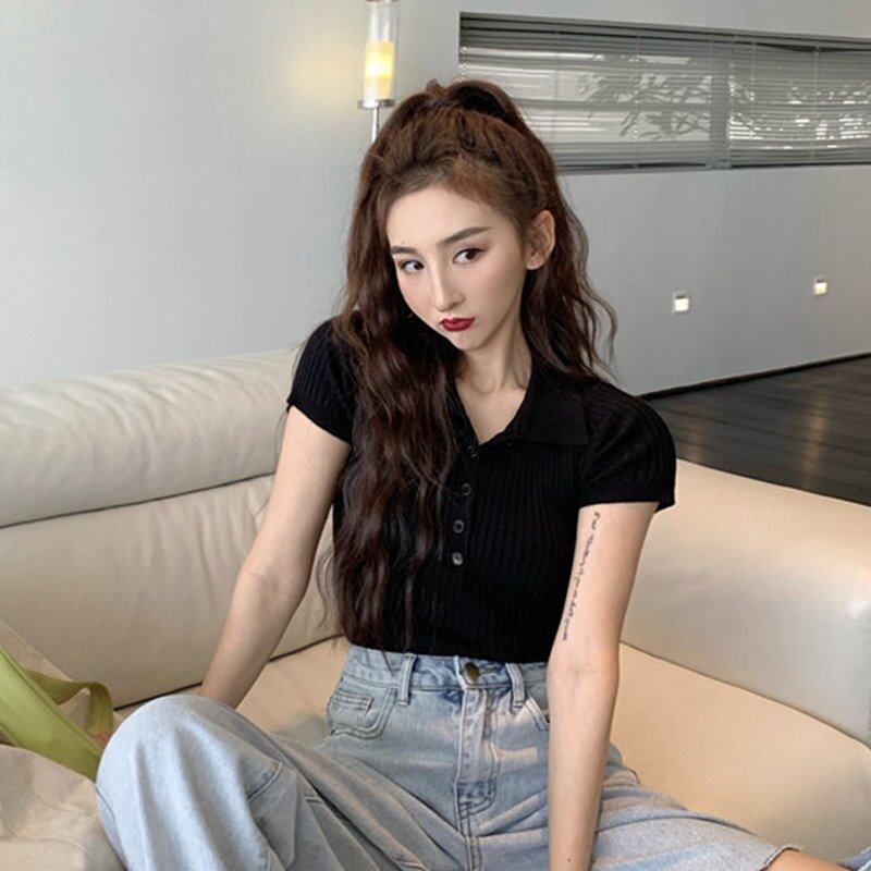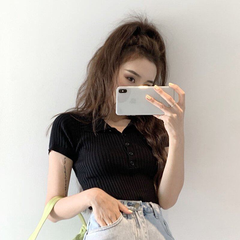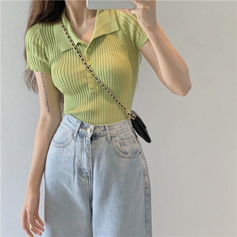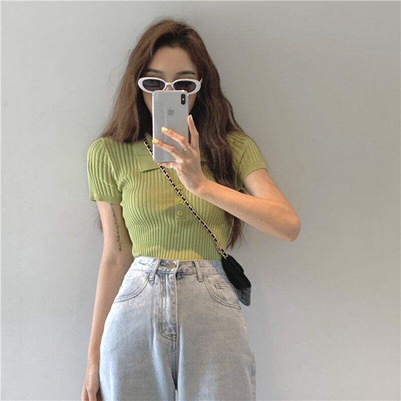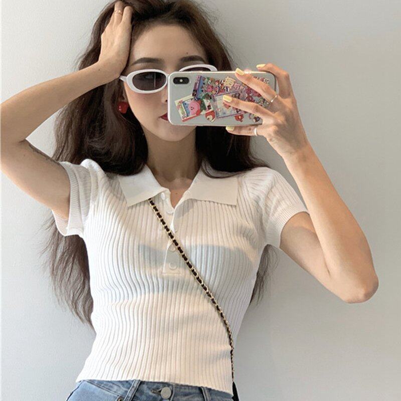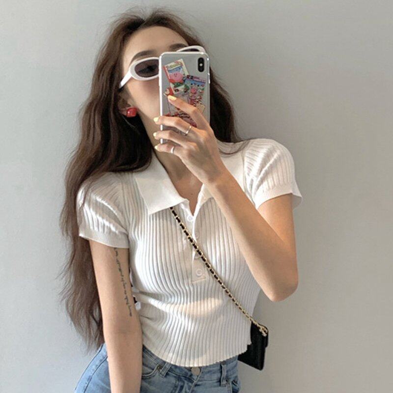 INWPLLR Women Tshirts Chic Slim Female Ins Style Botton Turn-down Collar Top Tees Solid Color Thin Knitted Crop T-shirt