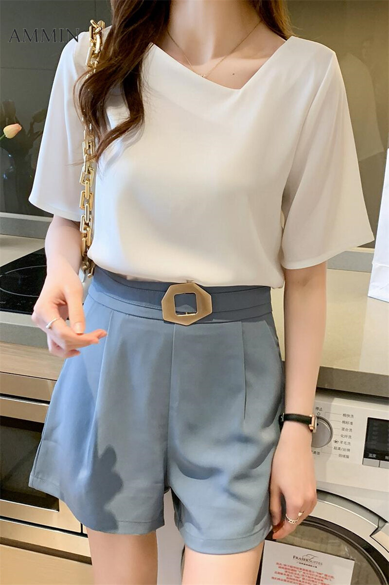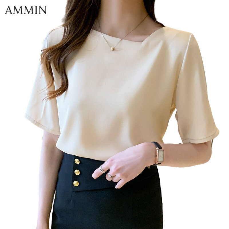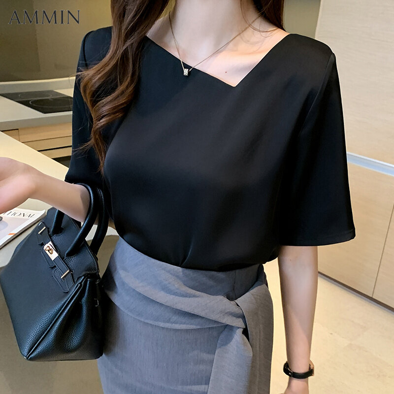 AMMIN 2022 summer new all-match satin slant-neck short-sleeved shirt women's Korean style fashion elegant side V-neck chiffon top