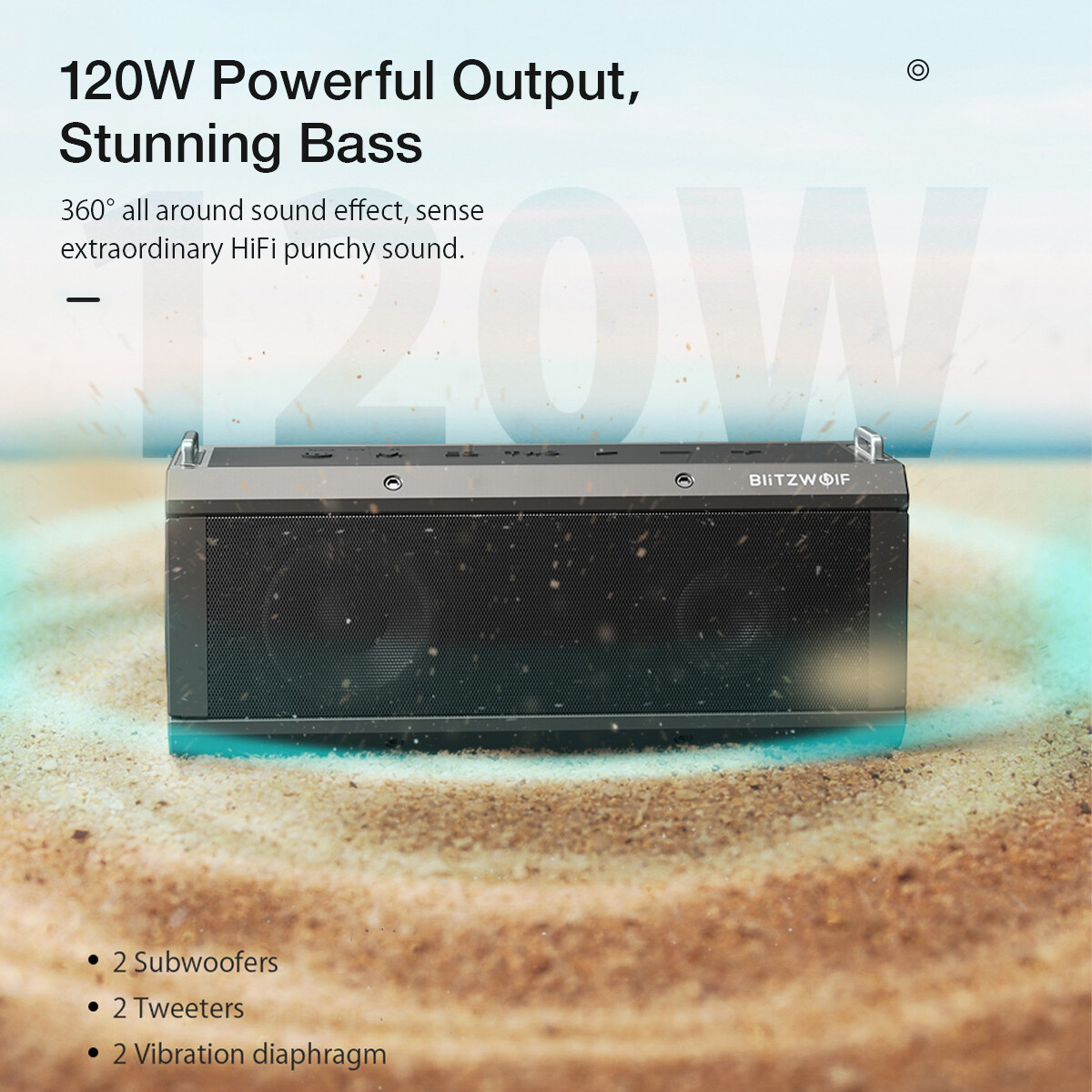 1. 120W Powerful Output-- Enhanced with a strong 120W driver and DSP technology, the BW-WA3 Pro speaker delivers stereo sound with rich bass, tight mids and crystal clear highs. 360° all around sound effect, sense extraoridinary HiFi punchy sound.