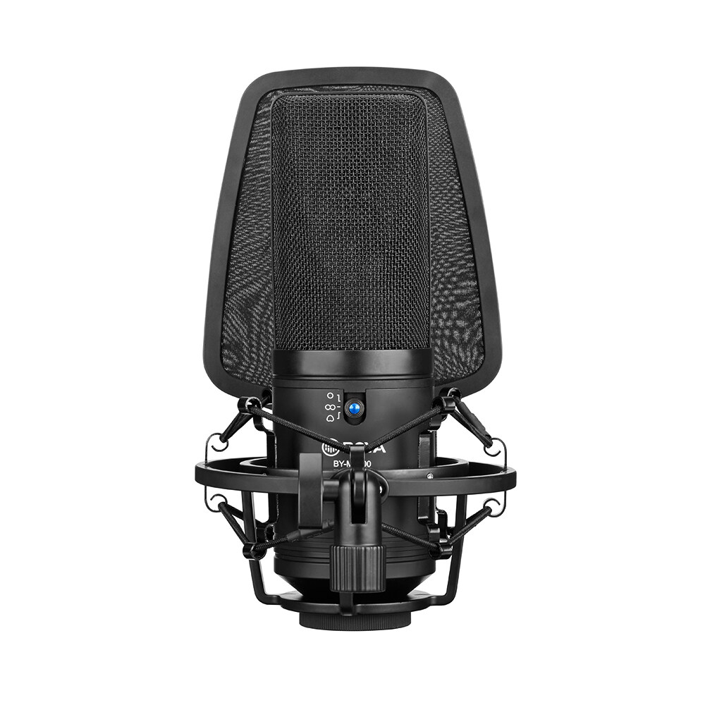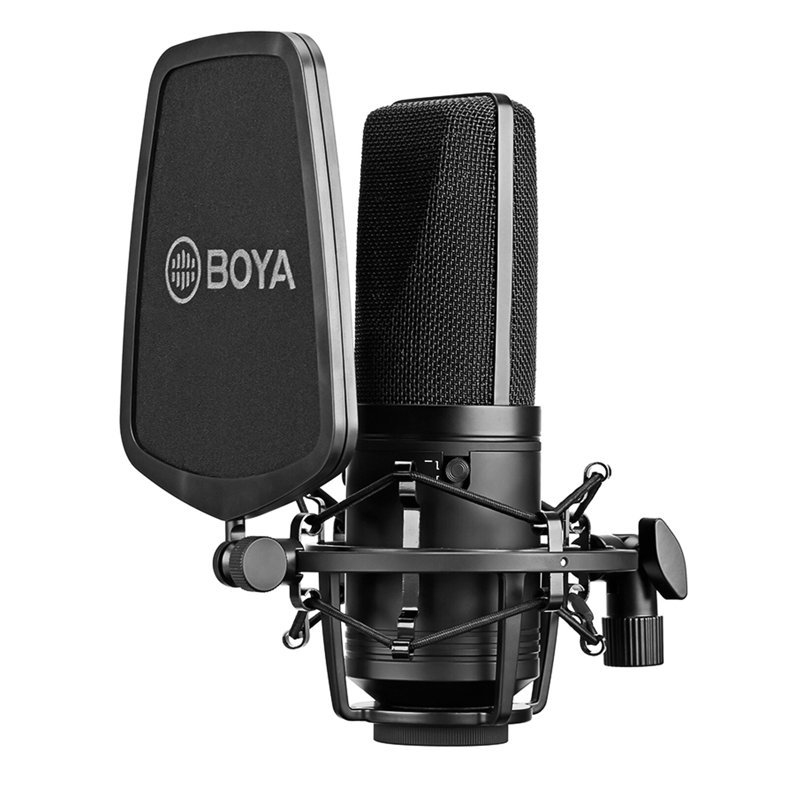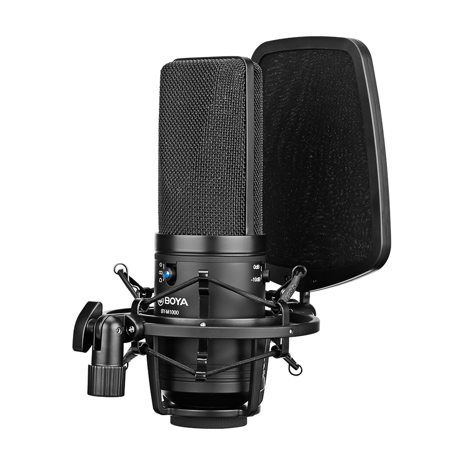 The BOYA BY-M1000 is a 34mm/1.3in diaphragm condenser microphone, with sturdy all-metal housing, it can be mounted on 5/8 inch arm stand. Included shockmount & pop filter.