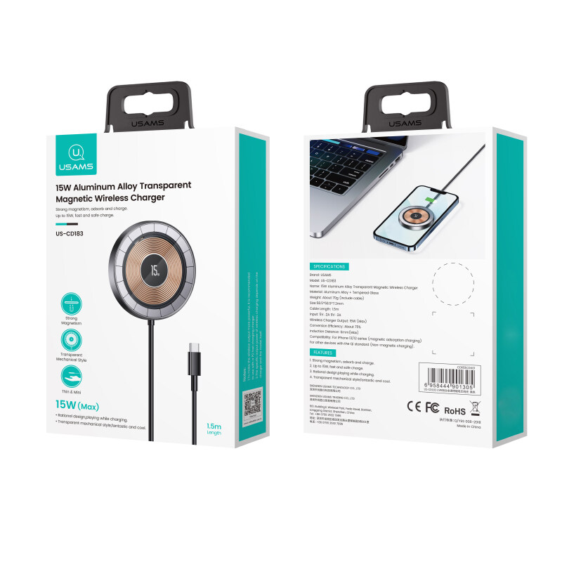 USAMS 15W Magnetic Wireless Charger Transparent Mechanical Style Ultra-Thin Automatic Coil Induction PD Fast Charging For iP/Xiaomi /Samsung / Oppo / Vivo / Huawei