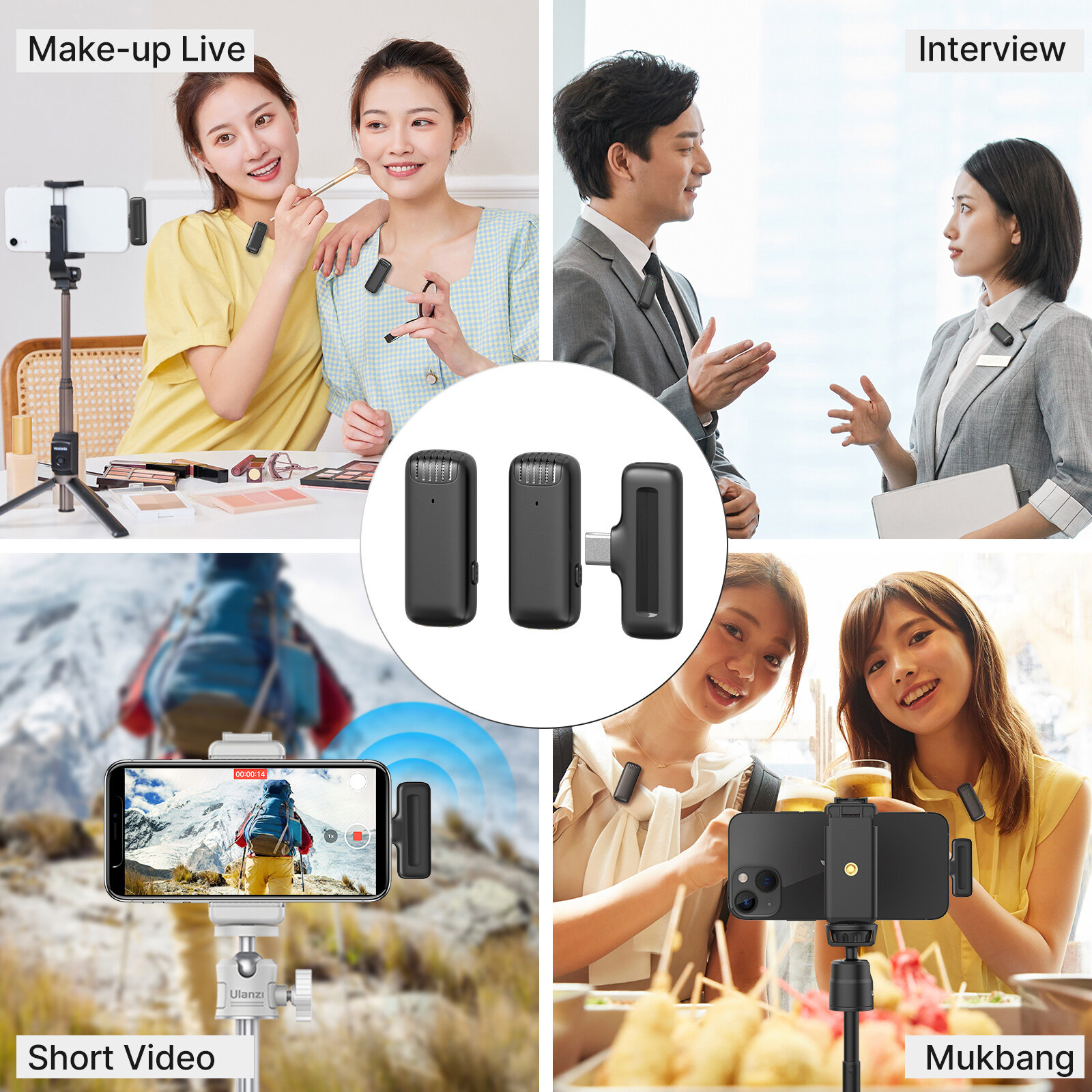 【Wireless Microphone System】Including 1 receivers & 2 microphone transmitters, supports dual microphone simultaneous recording, plug-and-play, no APP needed, very suitable for phone vlog, live streaming, interview, online chatting, etc.