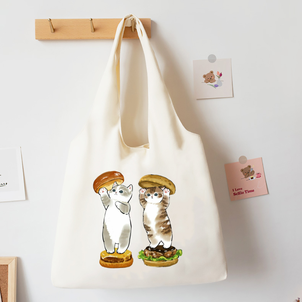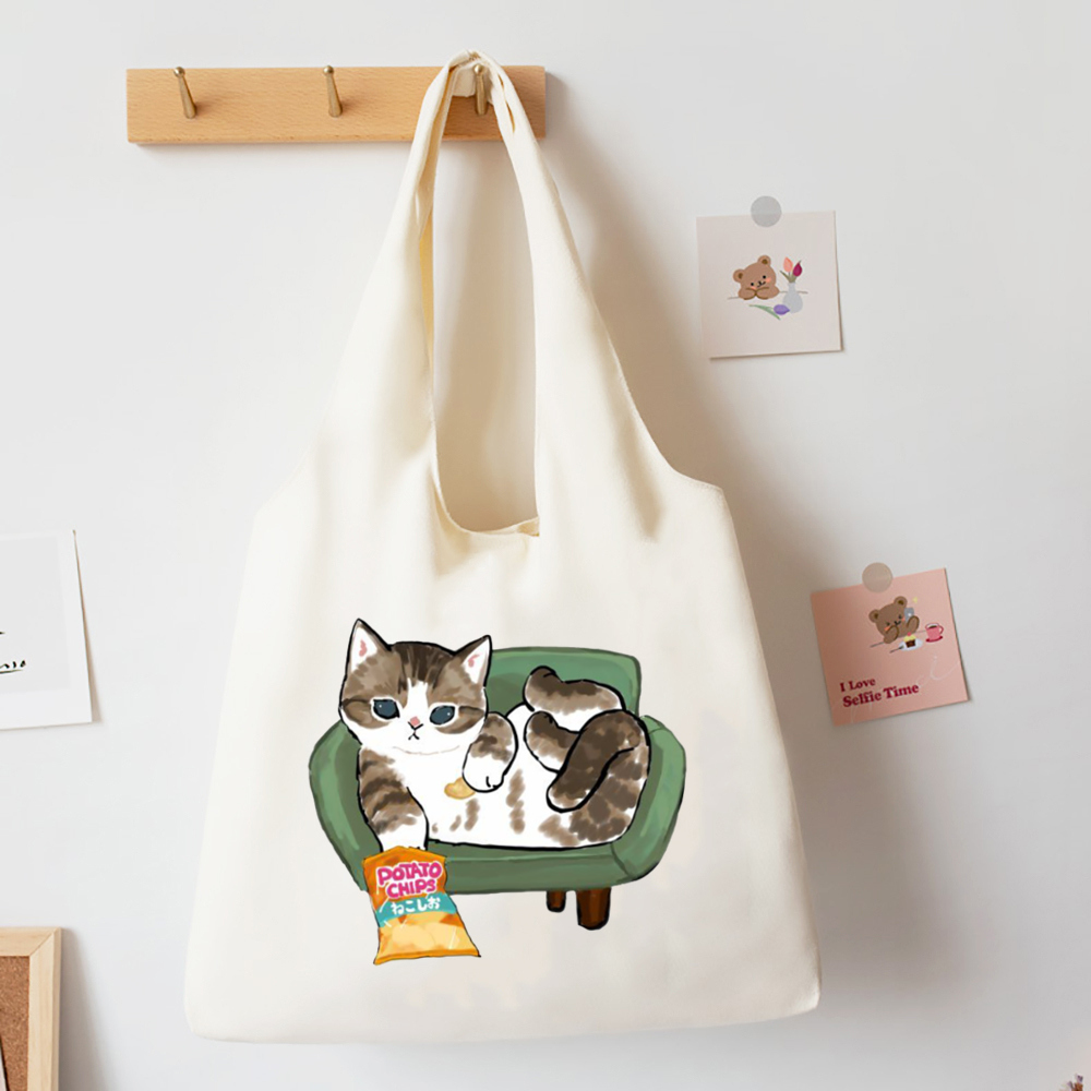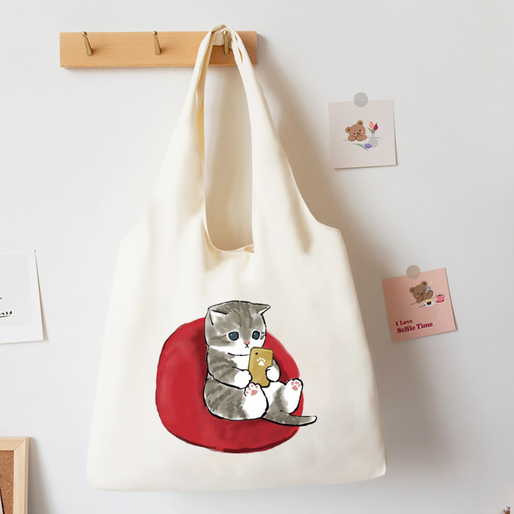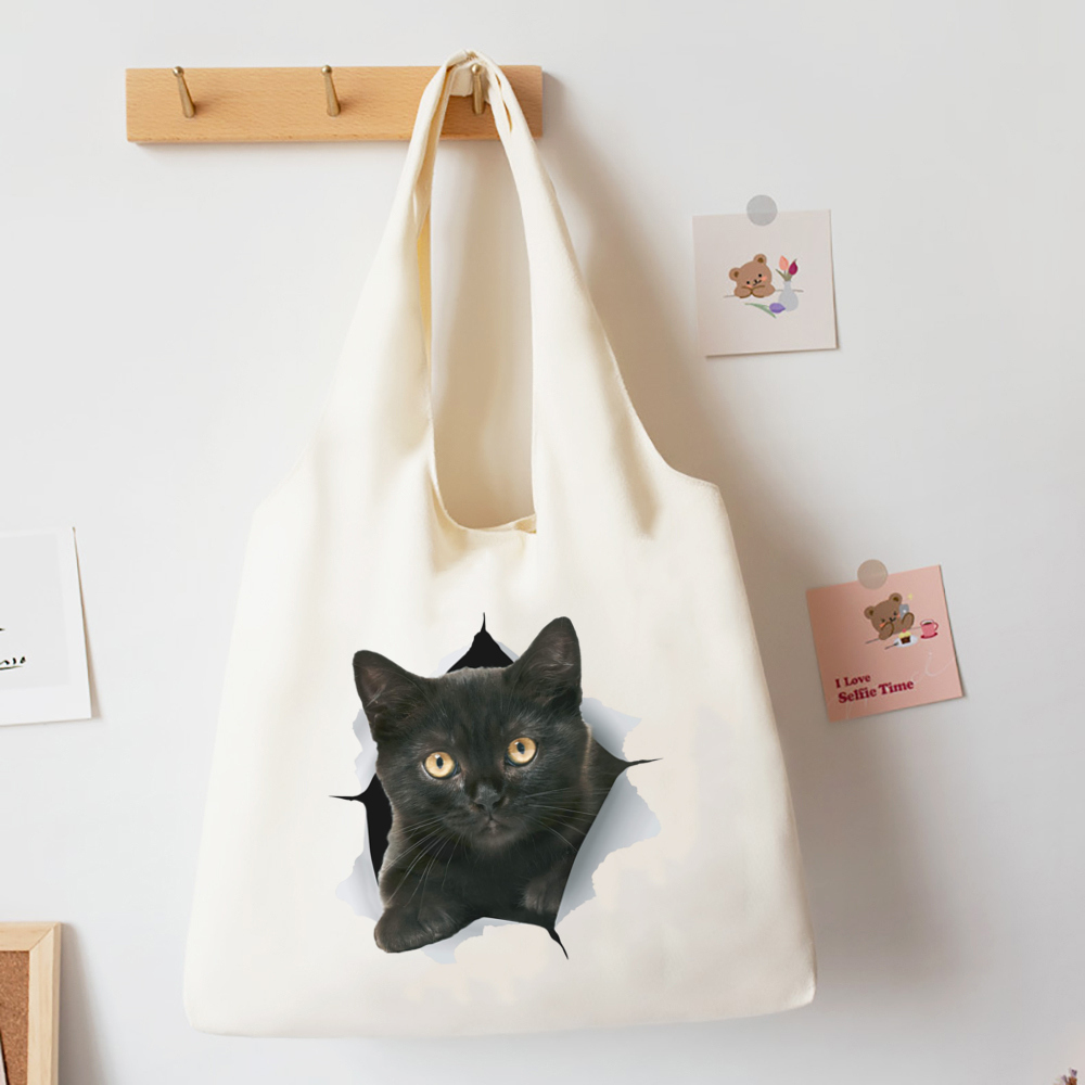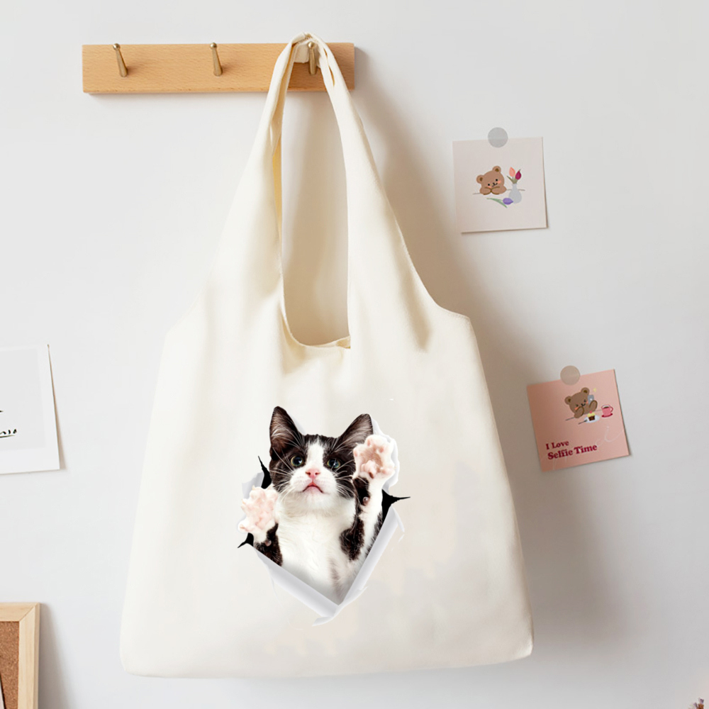 Cute Cat Print Canvas Tote Bag Casual Storage Bags Large Capacity Shopping Bag Women Totebag for Student Shoulder Bag 帆布包 Ins