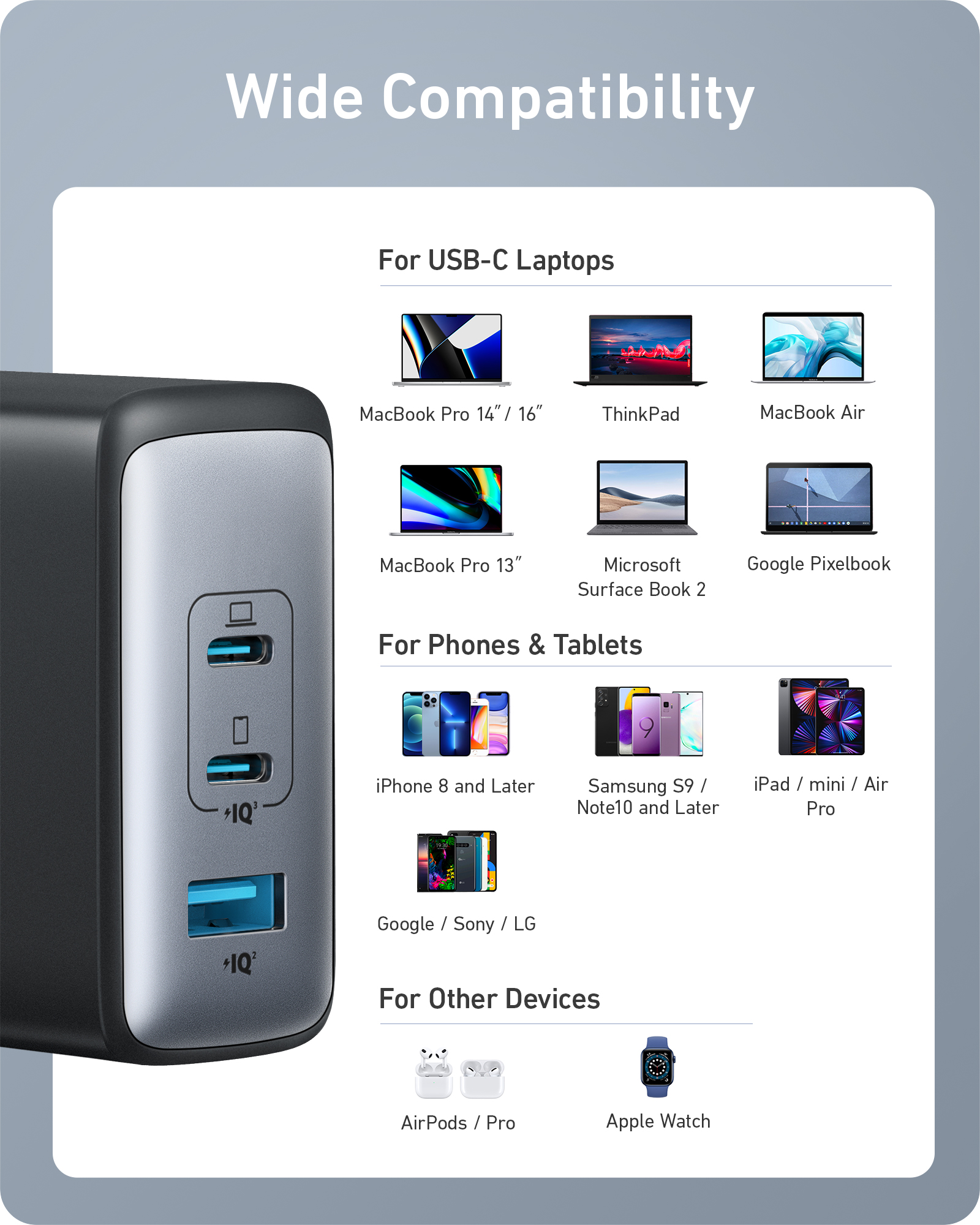 Triple Port: USB-C 1 (45W Max), USB-C 2 (30W Max), USB-A (18W Max)
