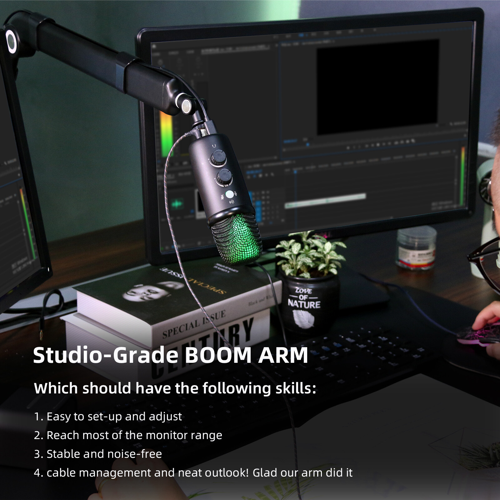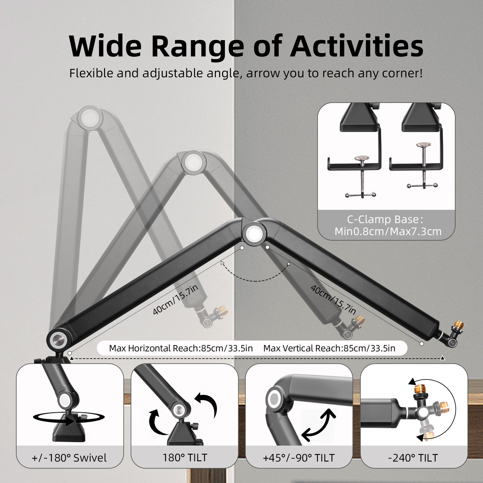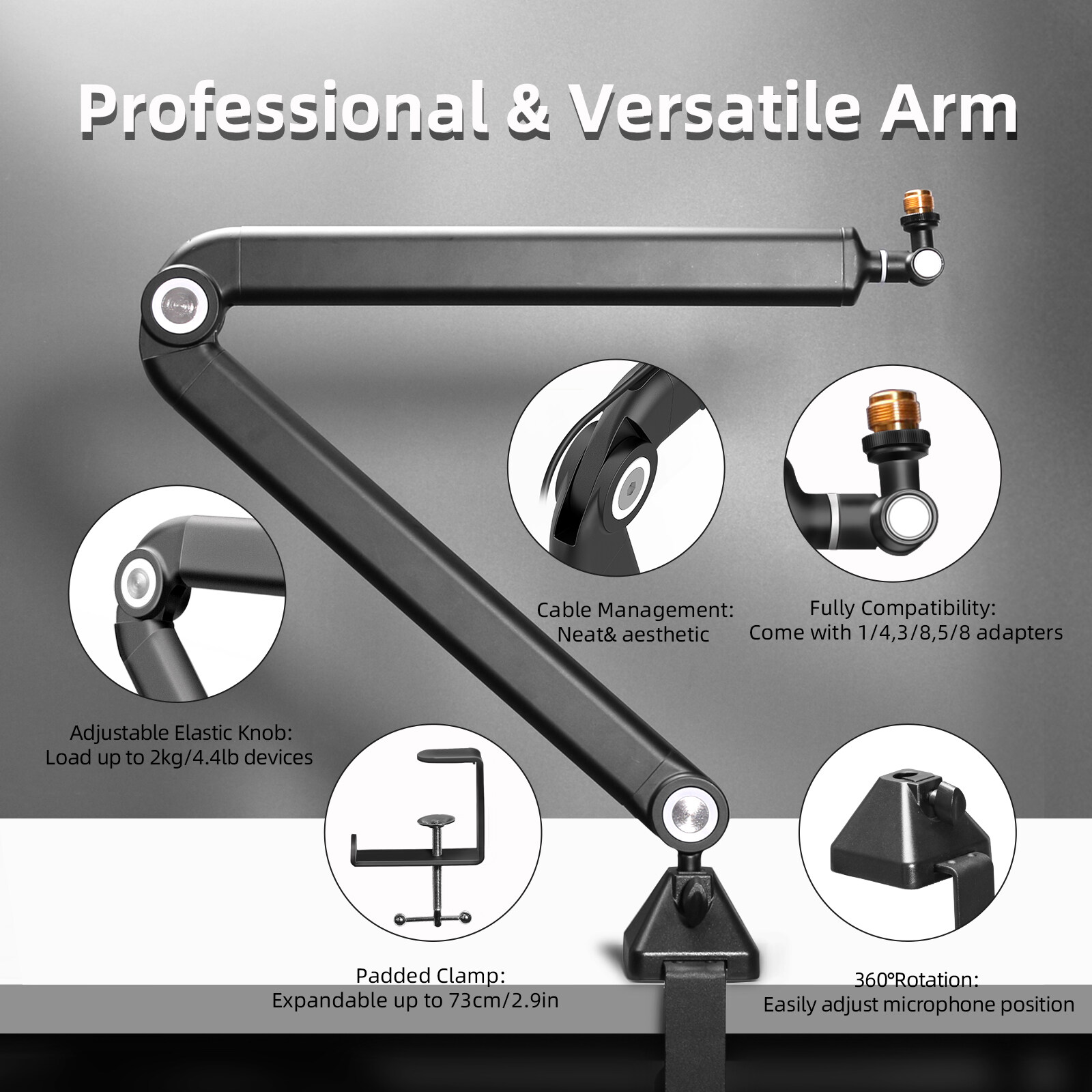 This boom microphone stand is up to 33 inches vertically and 33 inches horizontally, compatible with most monitors, and supports 360° rotation. After setting the adjustment valve according to the weight of the microphone, you can still adjust the microphone to the most suitable position and keep it locked; it is easy to move it out of your field of view when you don't need it.