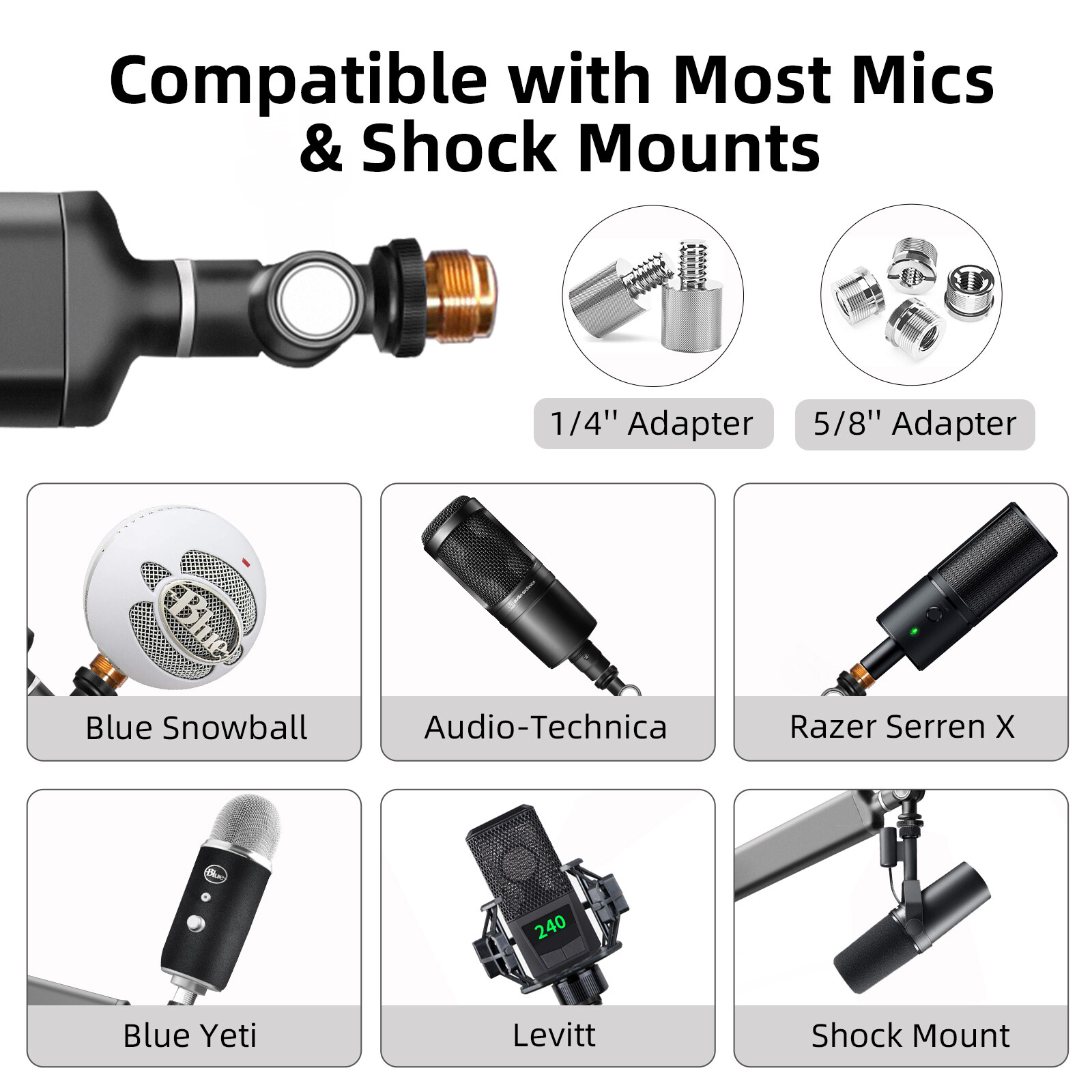 includes 3/8'' to 5/8'' adapter to connect most shock mounts and professional microphones such as Blue Yeti, Nano, Ice Snowball, Razer mini, RODE, Hyperx Quadcast and other microphones. The specially included 3/8'' to 1/4'' adapter allows you to connect cameras, smartphones and other devices (up to 2KG) to meet your diverse creative needs.