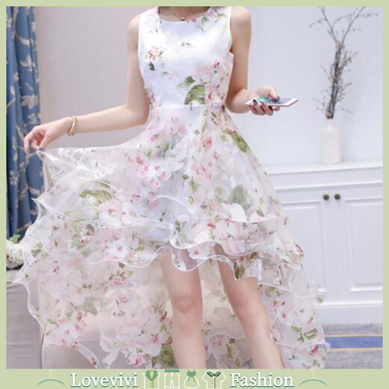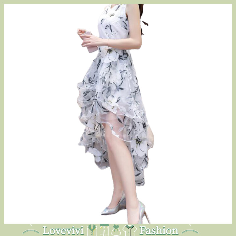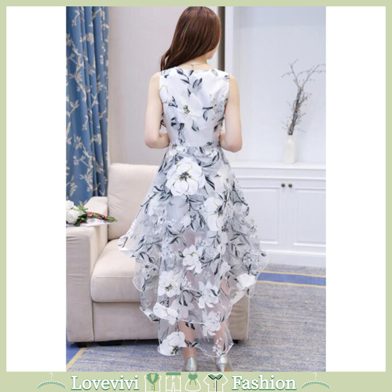 Women Summer Organza Puffy Dress Round Neck High Waist Sexy Sleeveless Floral Printing Mid-length Dress