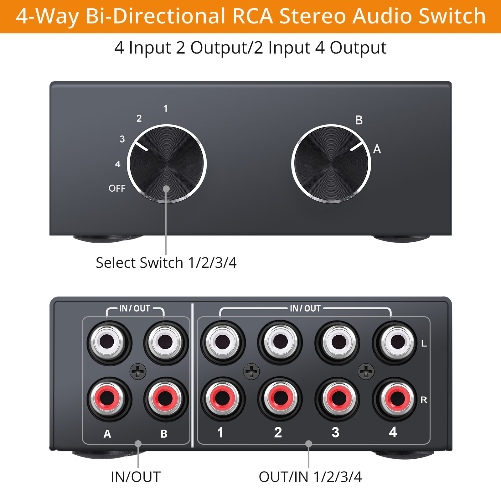 Neoteck 2 in 4 /4 in 2 Stereo L/R Sound Channel Bi-Directional Audio Switch Splitter with OFF Button and No External Power Required RCA Stereo Switch Selector for DVD Stereo Speaker CD Player