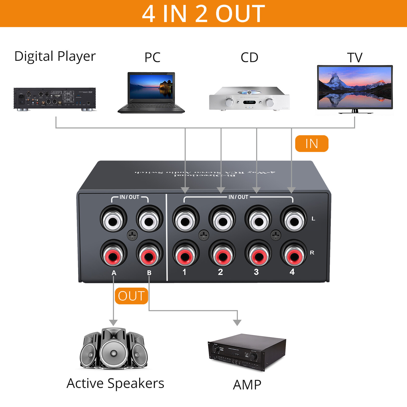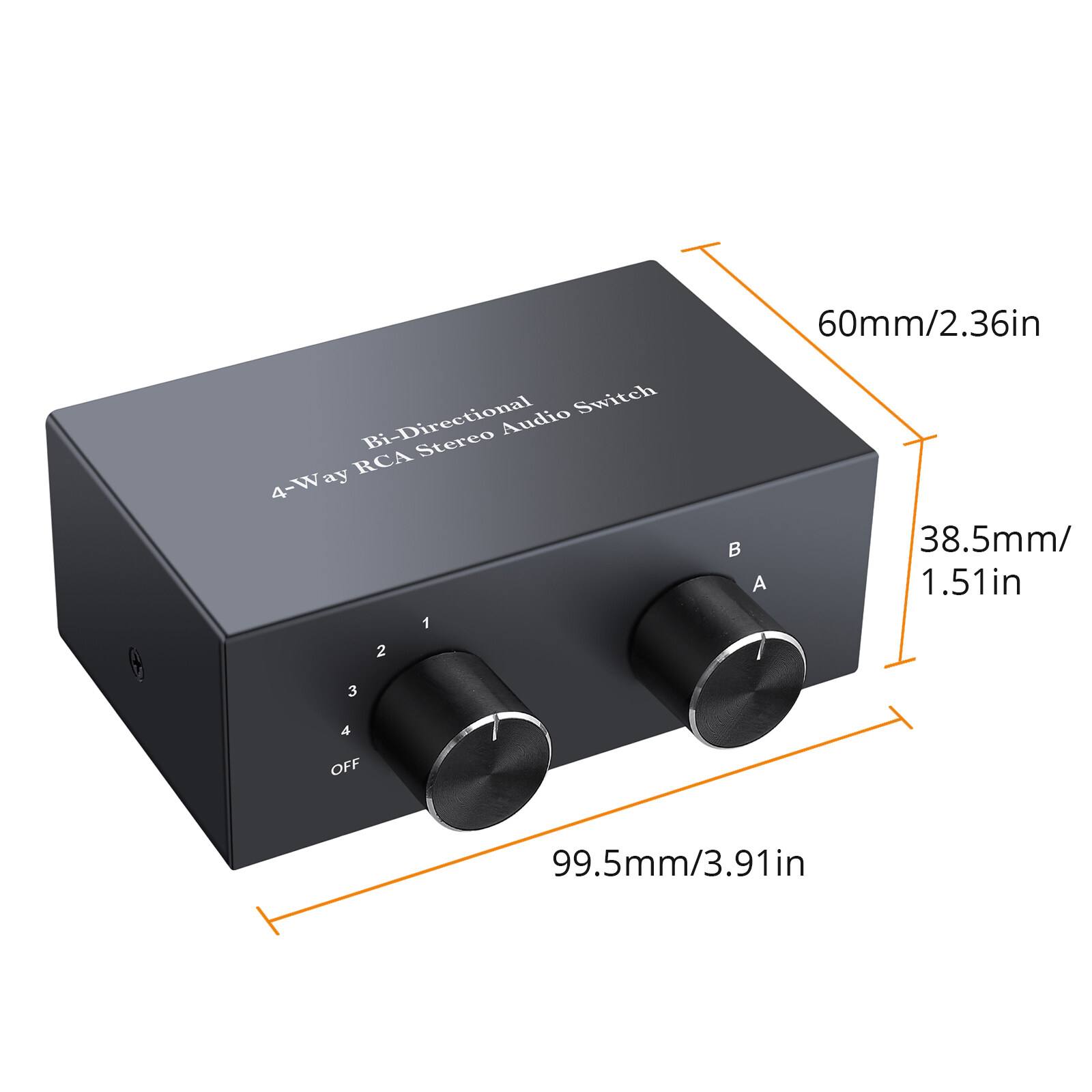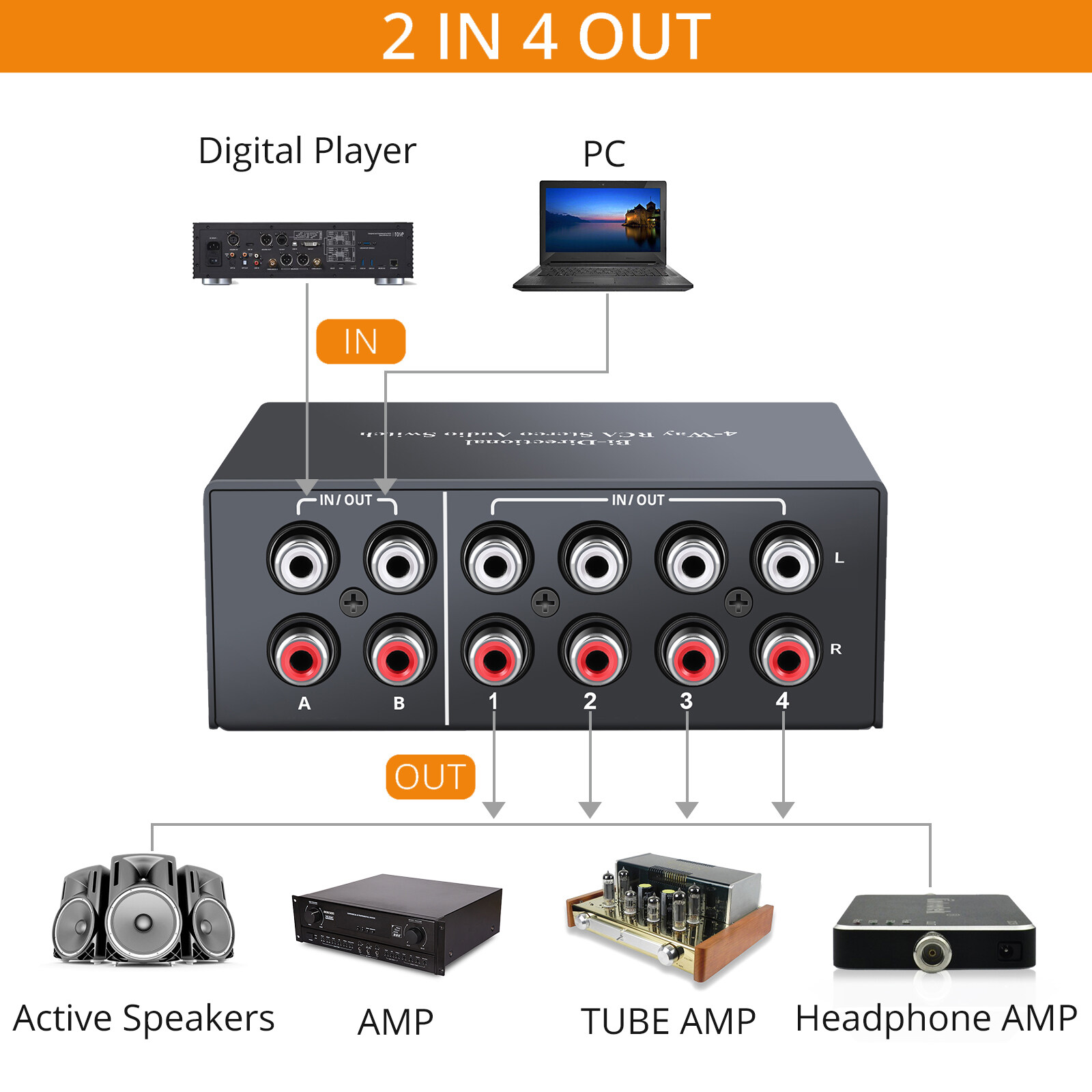 1. It can easily switch four RCA analog sound signal sources to A/B RCA analog signal amplification device.