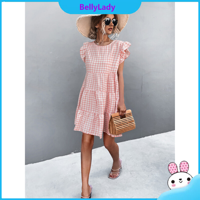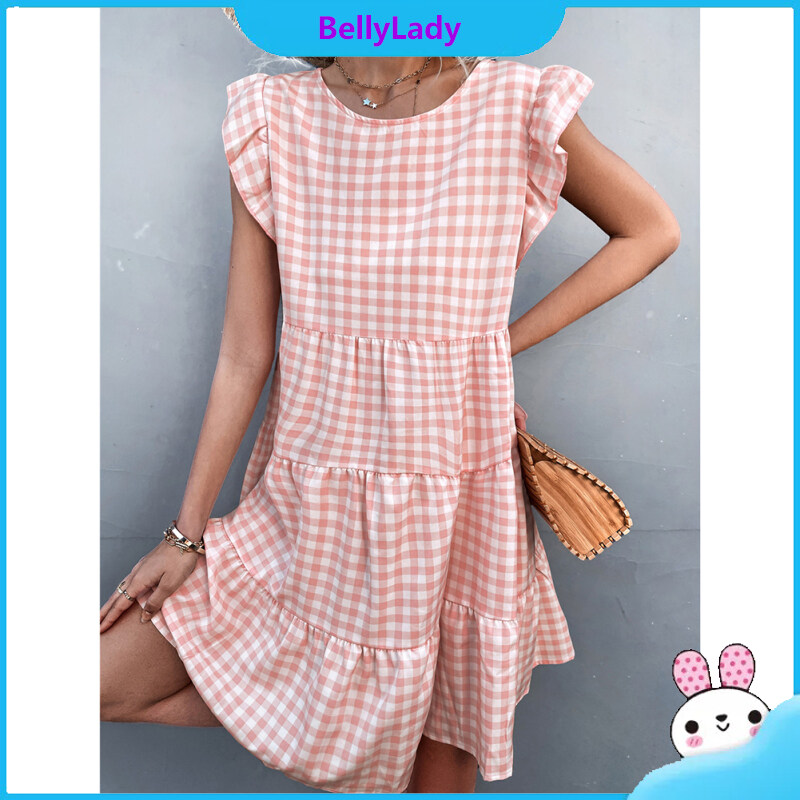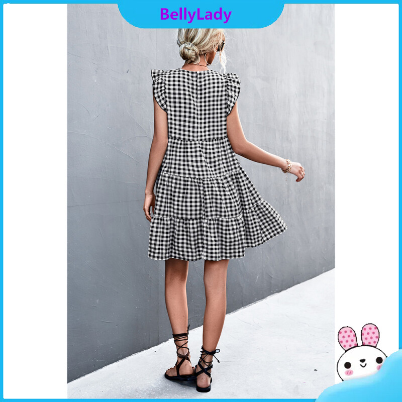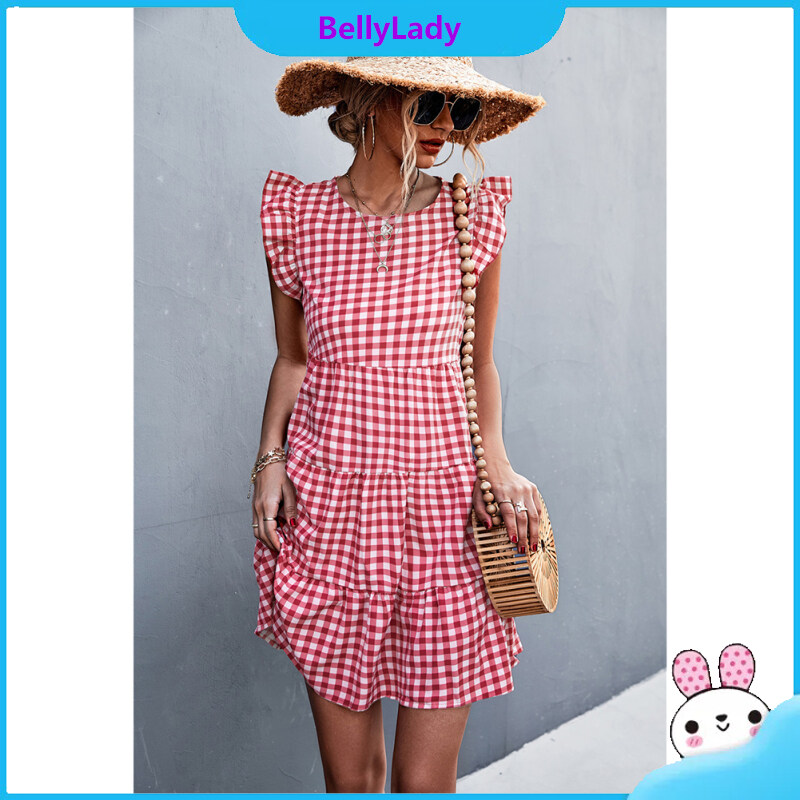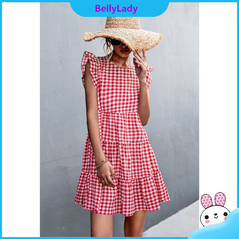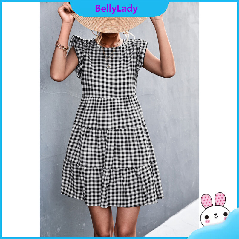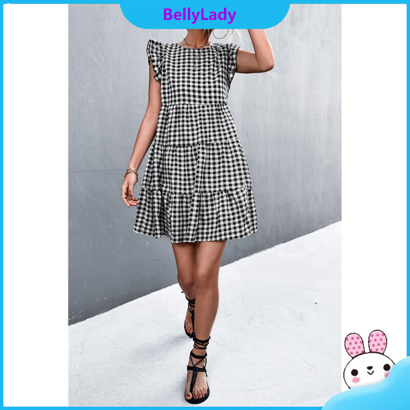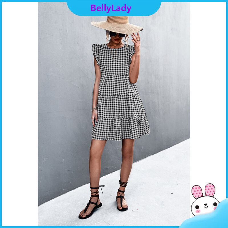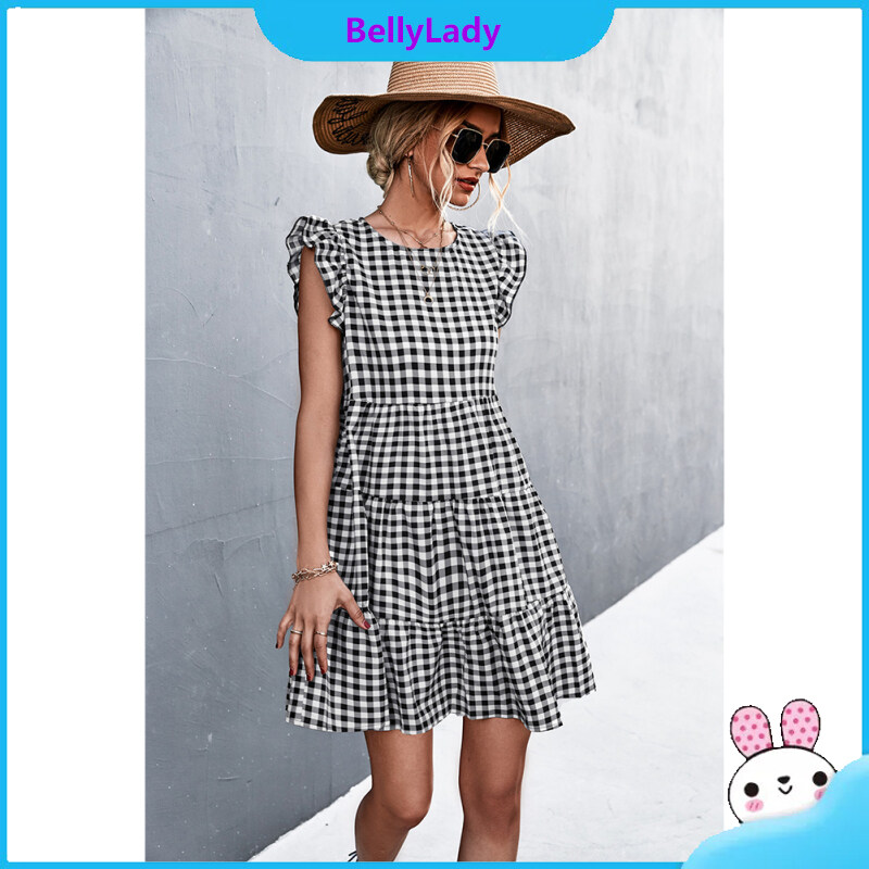 Women Plaid Printing Ruffled Short Skirt Round Neck Flutter Sleeves A-line Skirt Sleeveless High Waist Dress
