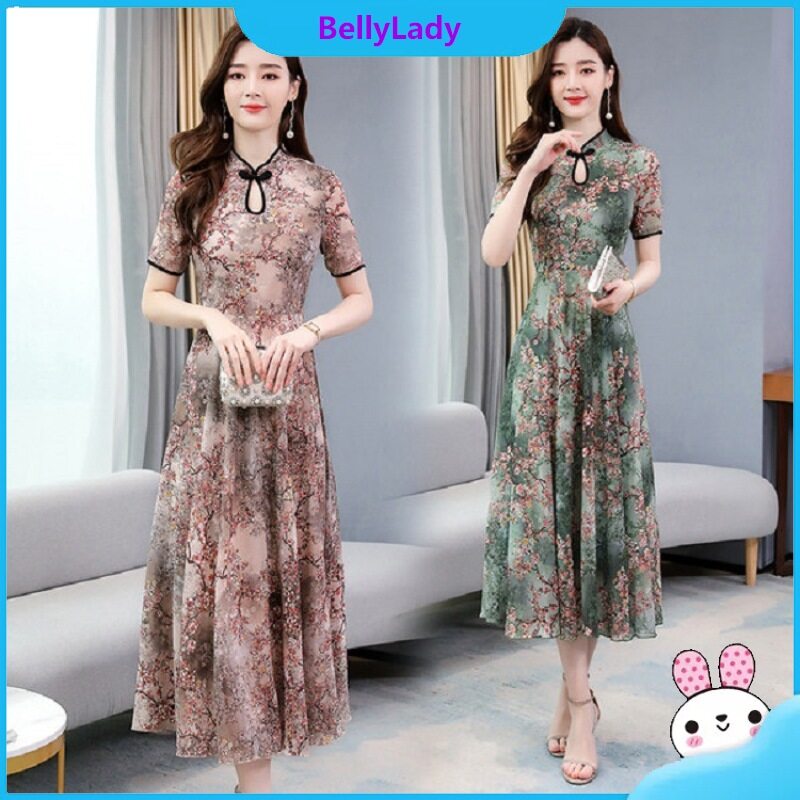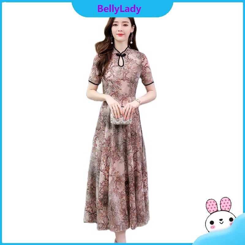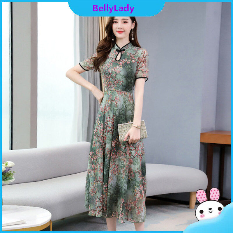 Women Summer Cheongsam Dress Short Sleeves Printing A-line Skirt Large Size Loose Midi Skirt