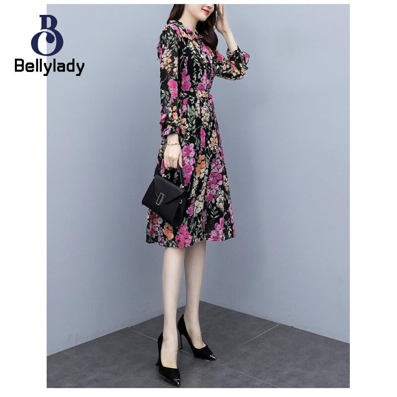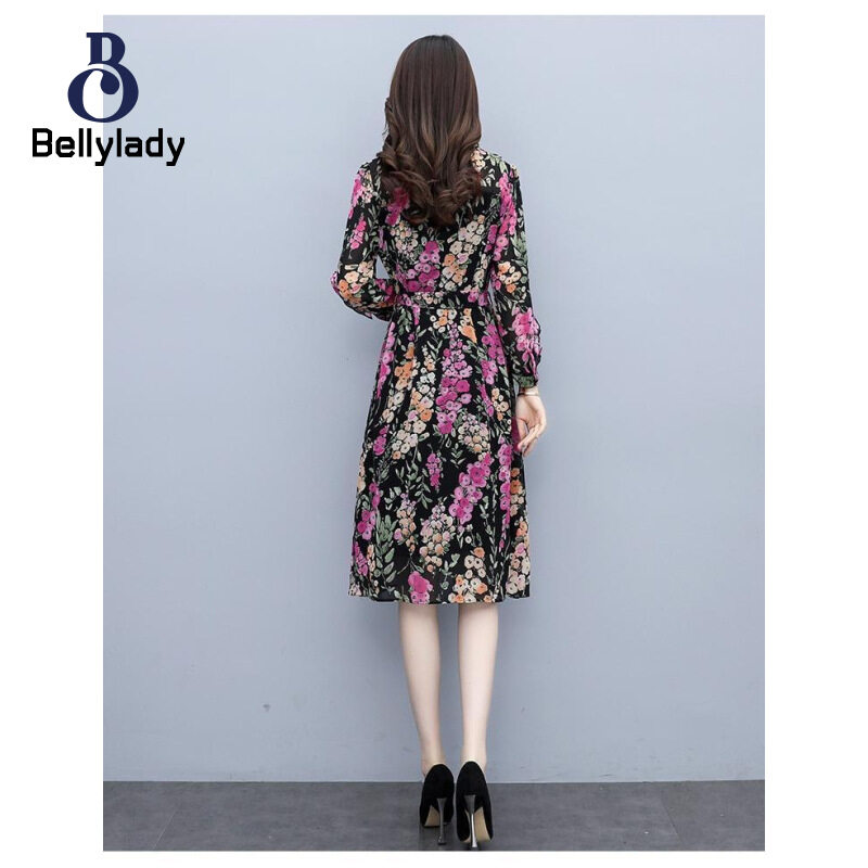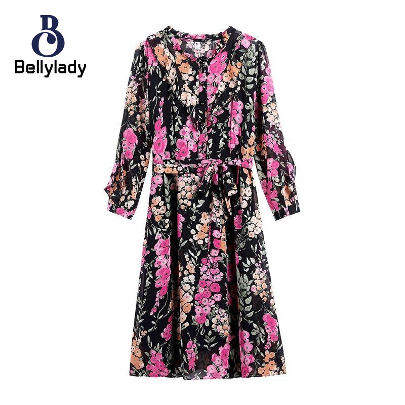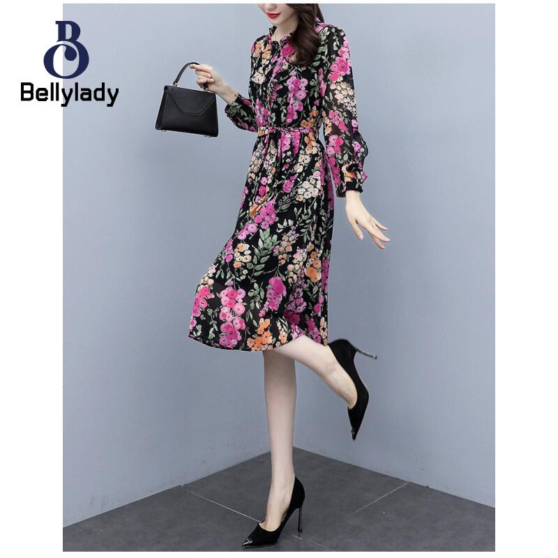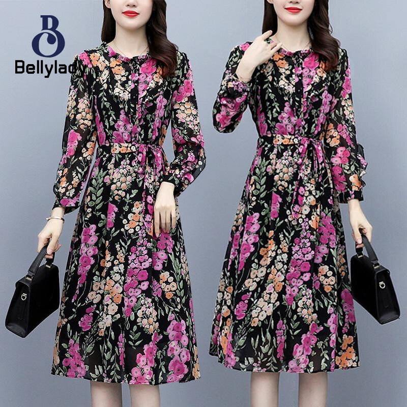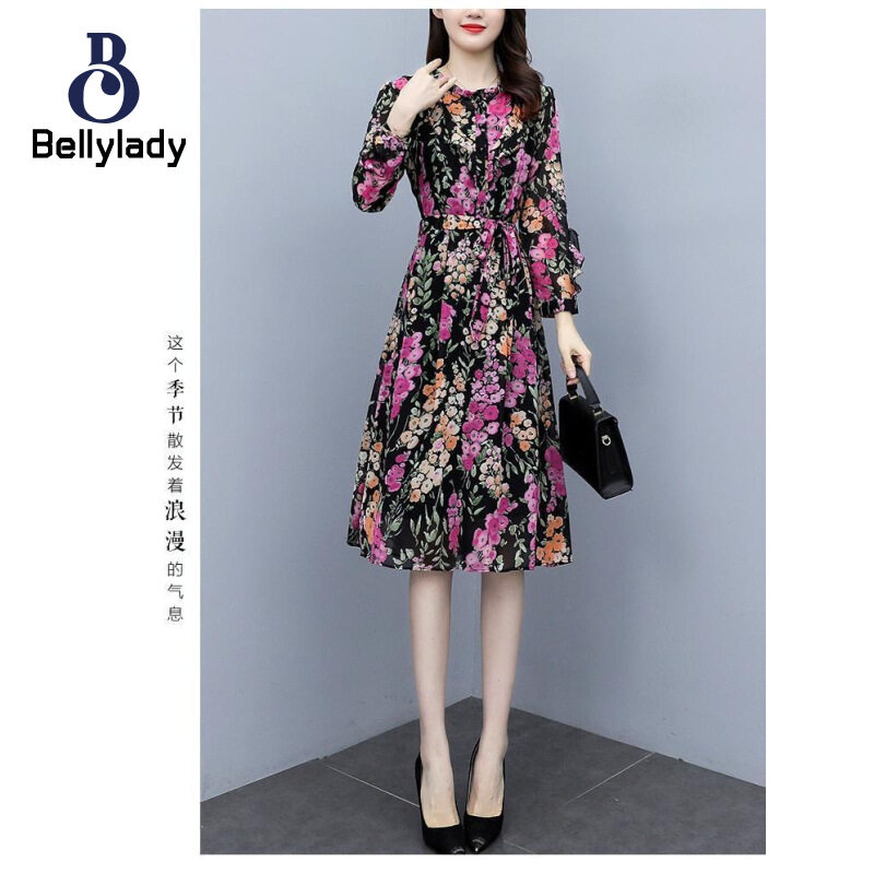 BellyLady Women Floral Dress Comfortable Breathable Lightweight Lace-up Round Neck Long-sleeved Midi Skirt