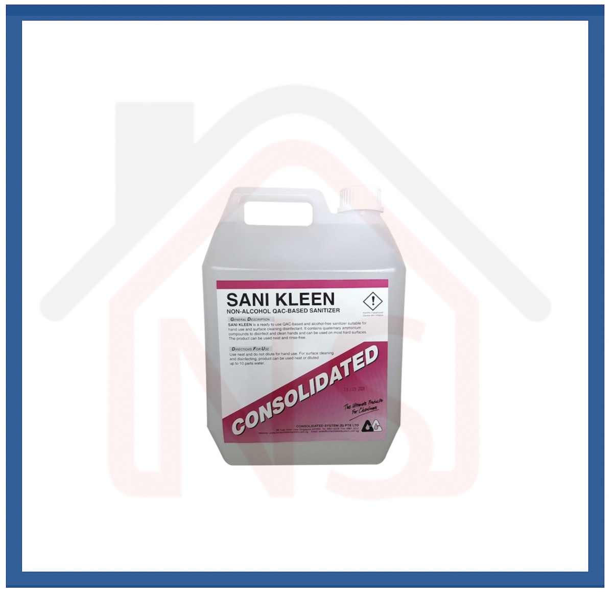 Sani Kleen is an alcohol-free, water-based hand sanitizer suitable for rinse-free hand application and surfaces. It contains over QACs and kills 99.999% of bacteria and germs on hands and surfaces without water. It contains QAC disinfectants and can help with infection control. Product is recommended to be used neat to ensure full efficacy.