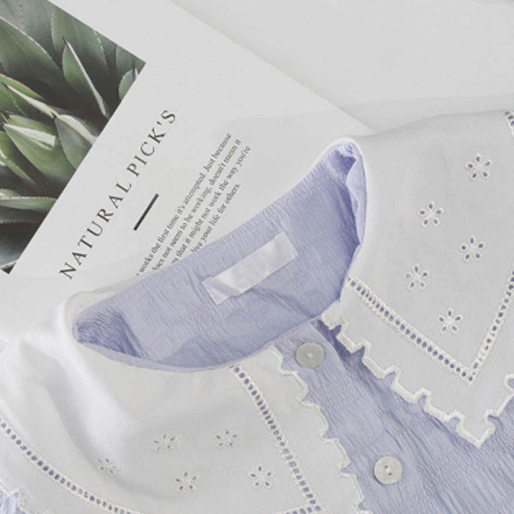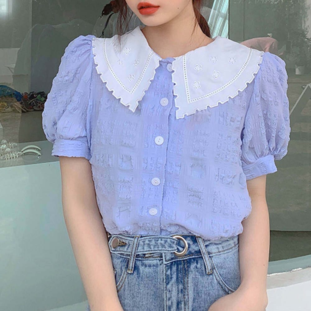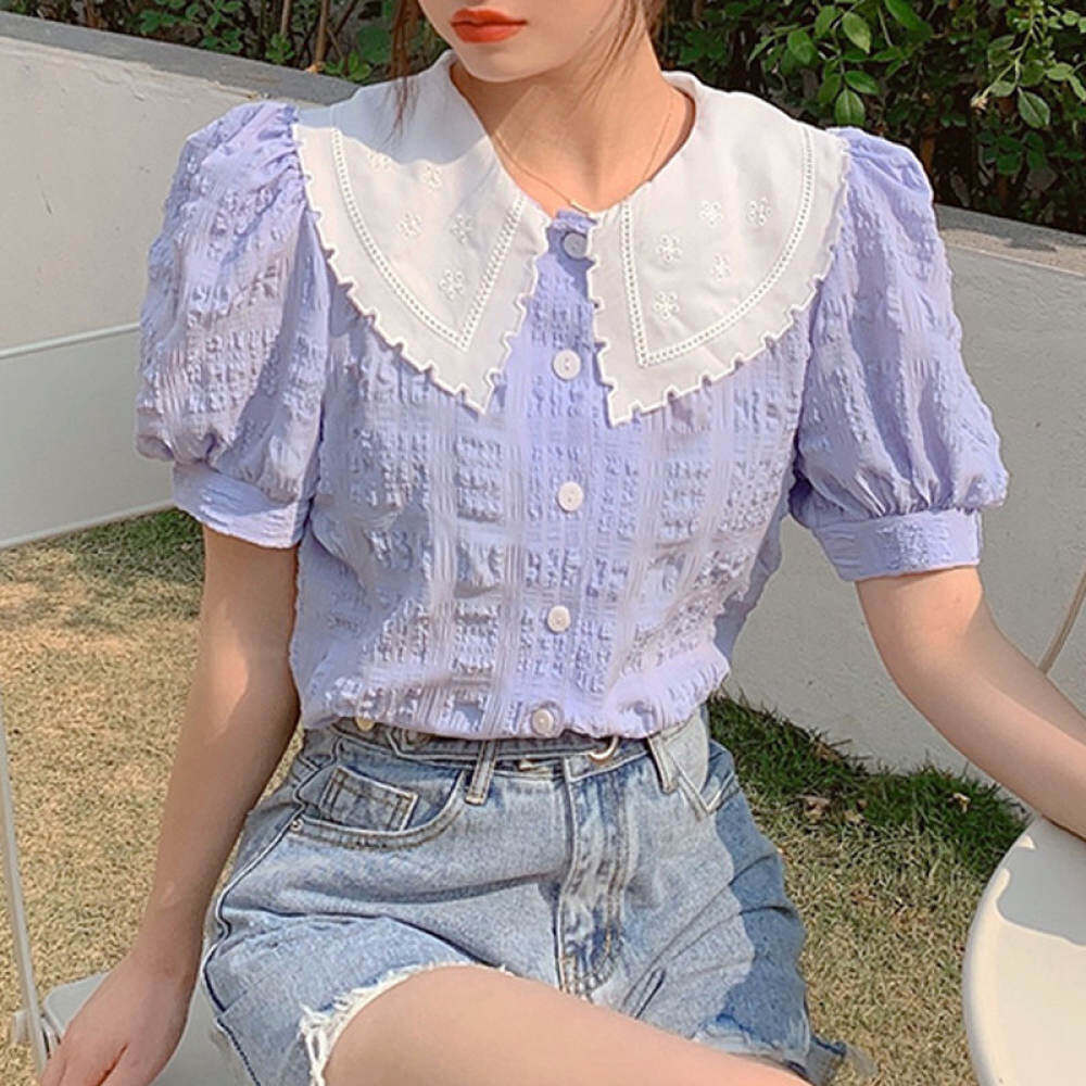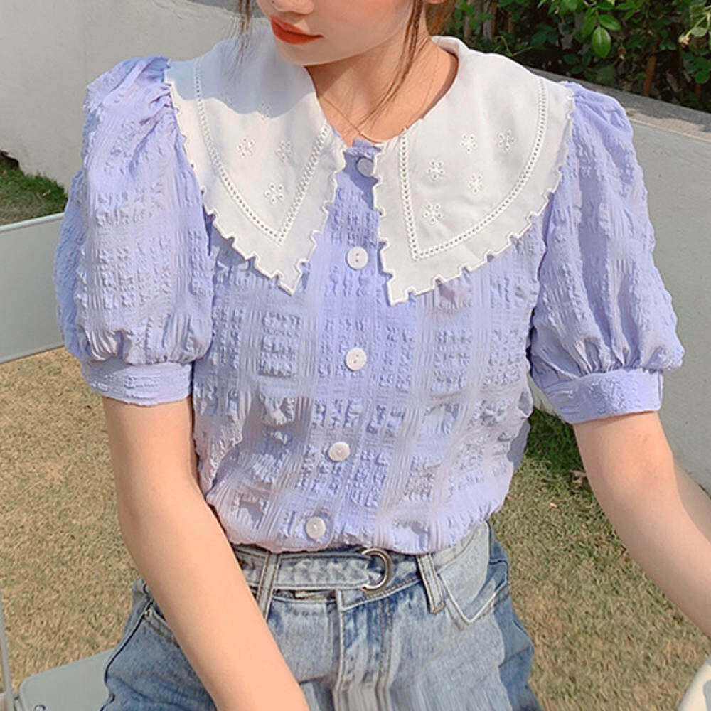 • INWPLLR Fashion Trends Taro Purple Blouses Women Korean-style Peter Pan Collar Tops Summer Sweet Short Sleeve Button Shirt Female