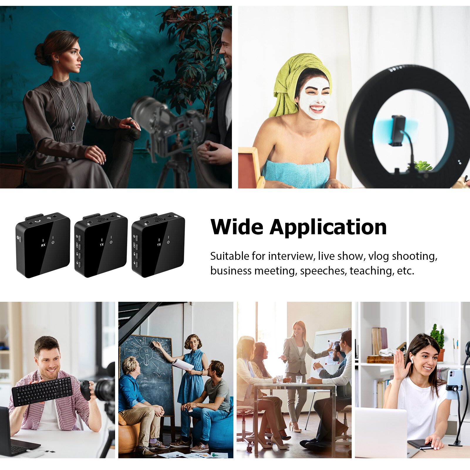 Long distance connection between transmitter and receiver, the set is suitable for interview, live show, vlog shooting, business meeting, speeches, teaching, etc.
