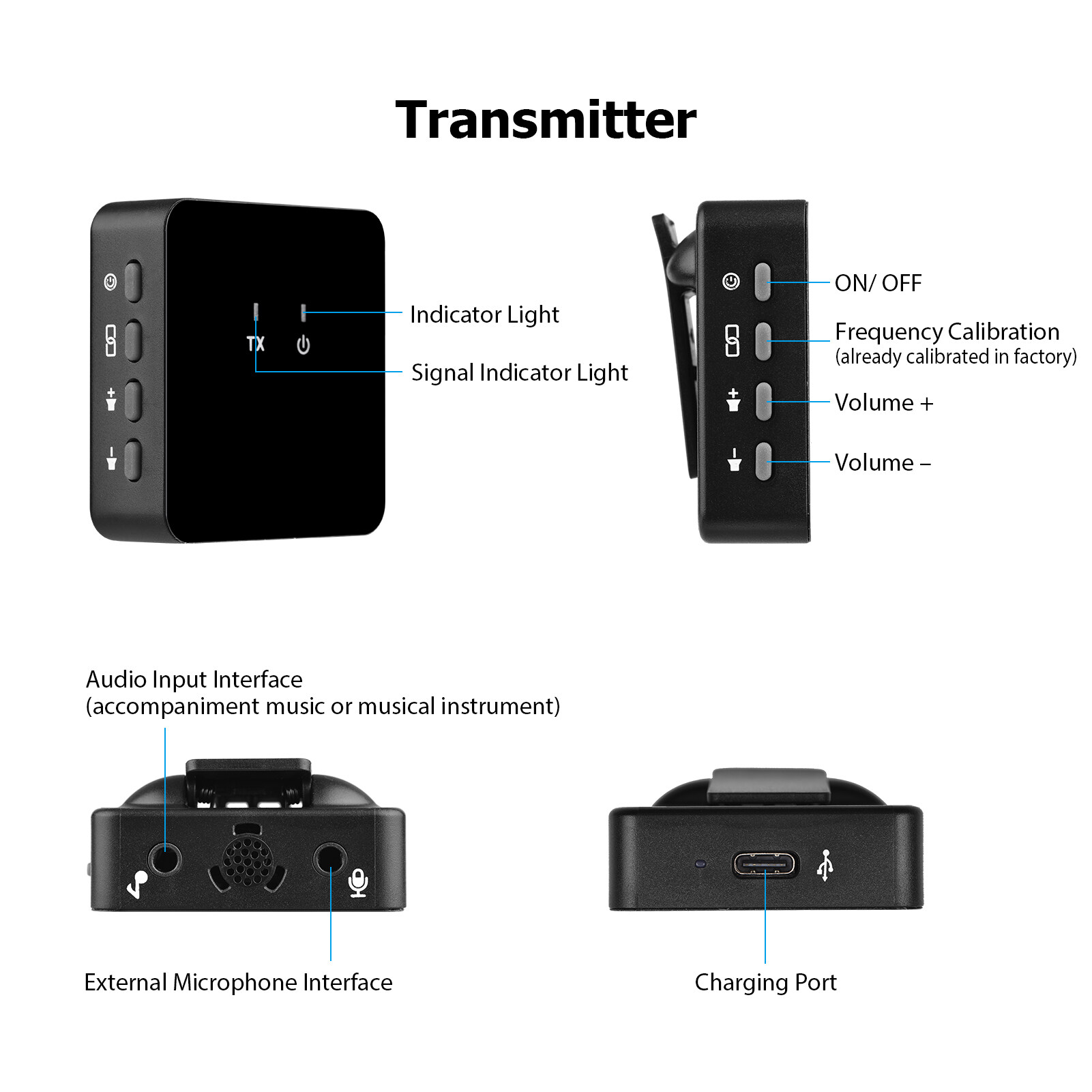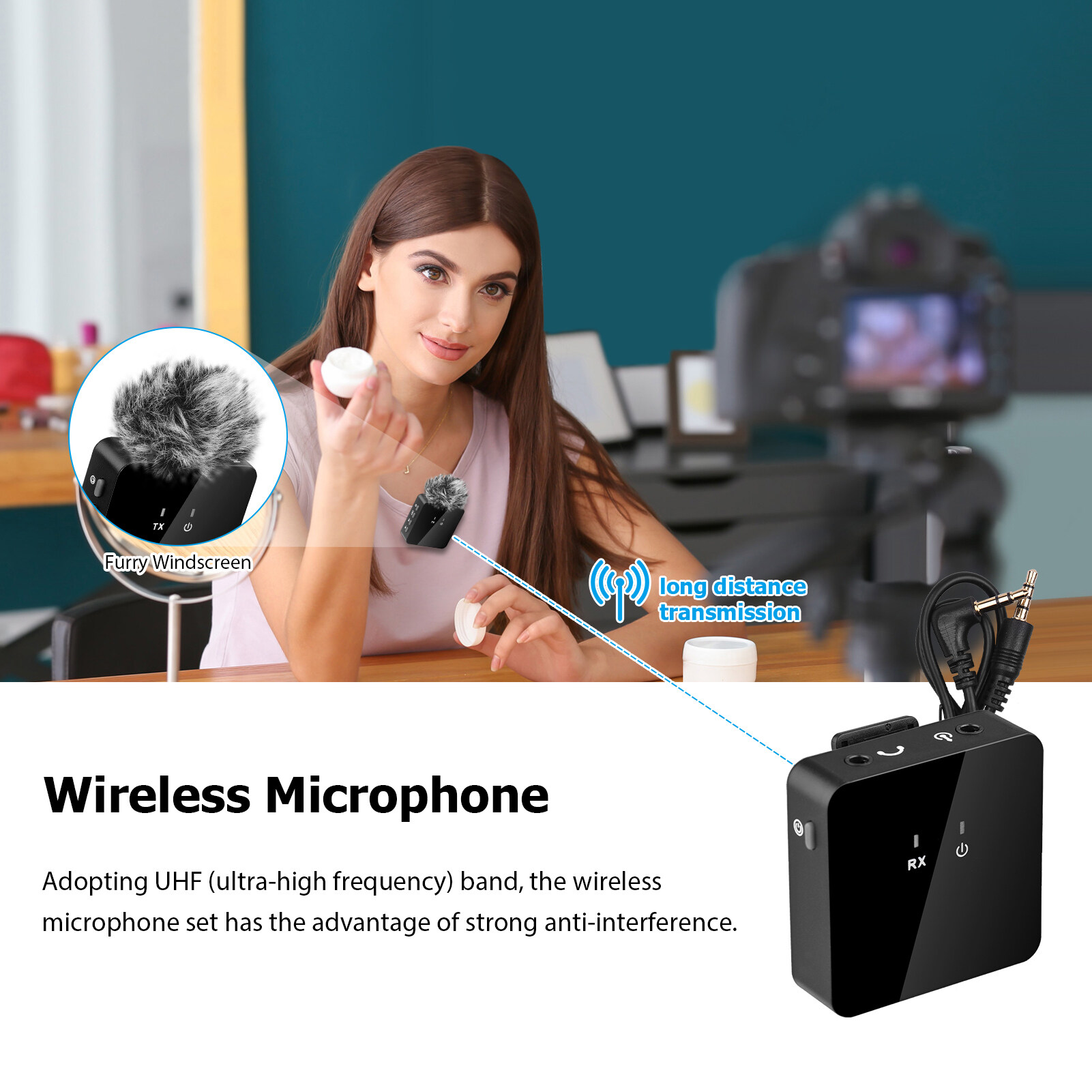 The transmitter can connect with accompaniment music or musical instrument; it also has external microphone interface; with furry windscreen; volume adjustable. The receiver can connect with phone or camera.