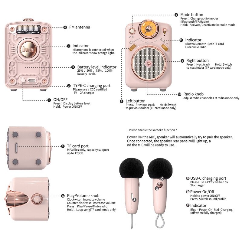 Divoom Fairy Mini Wireless Bluetooth Pink Portable Speakers Subwoofer Speaker Audio with Pink Mini Karaoke Condenser Microphone Mic Speaker
