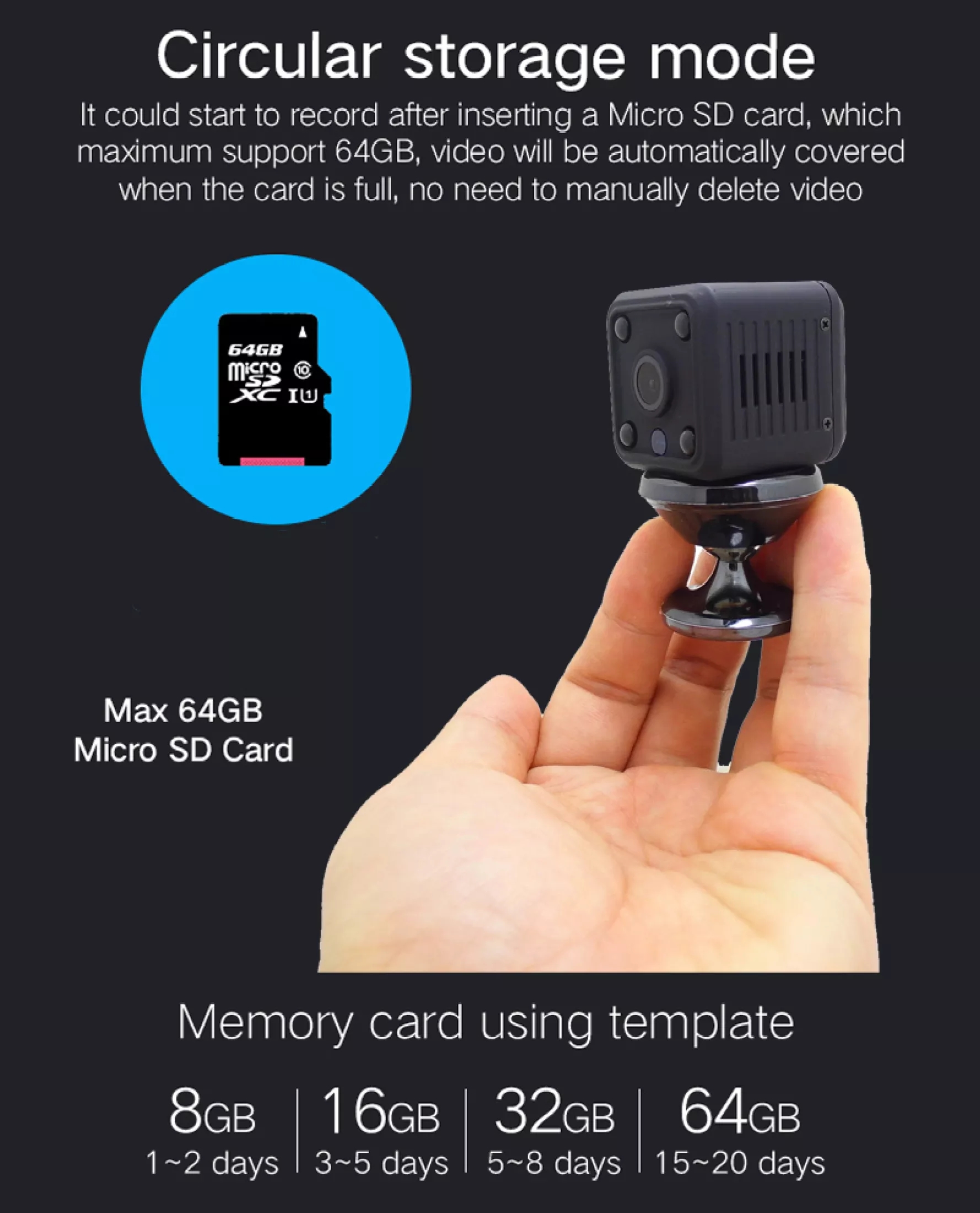 Automatic cycle video recorder, which supports up to 128GTF card, is small and light in size and easy to carry.