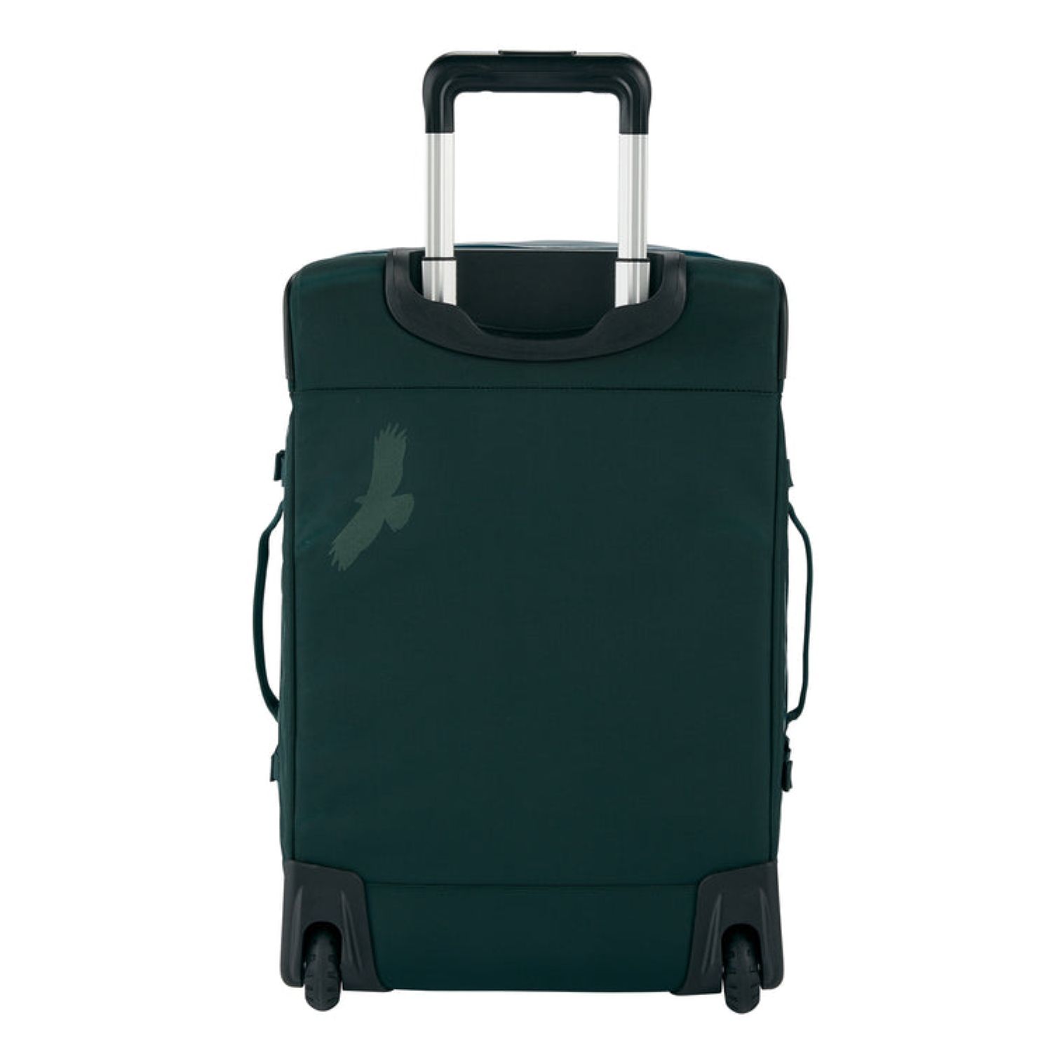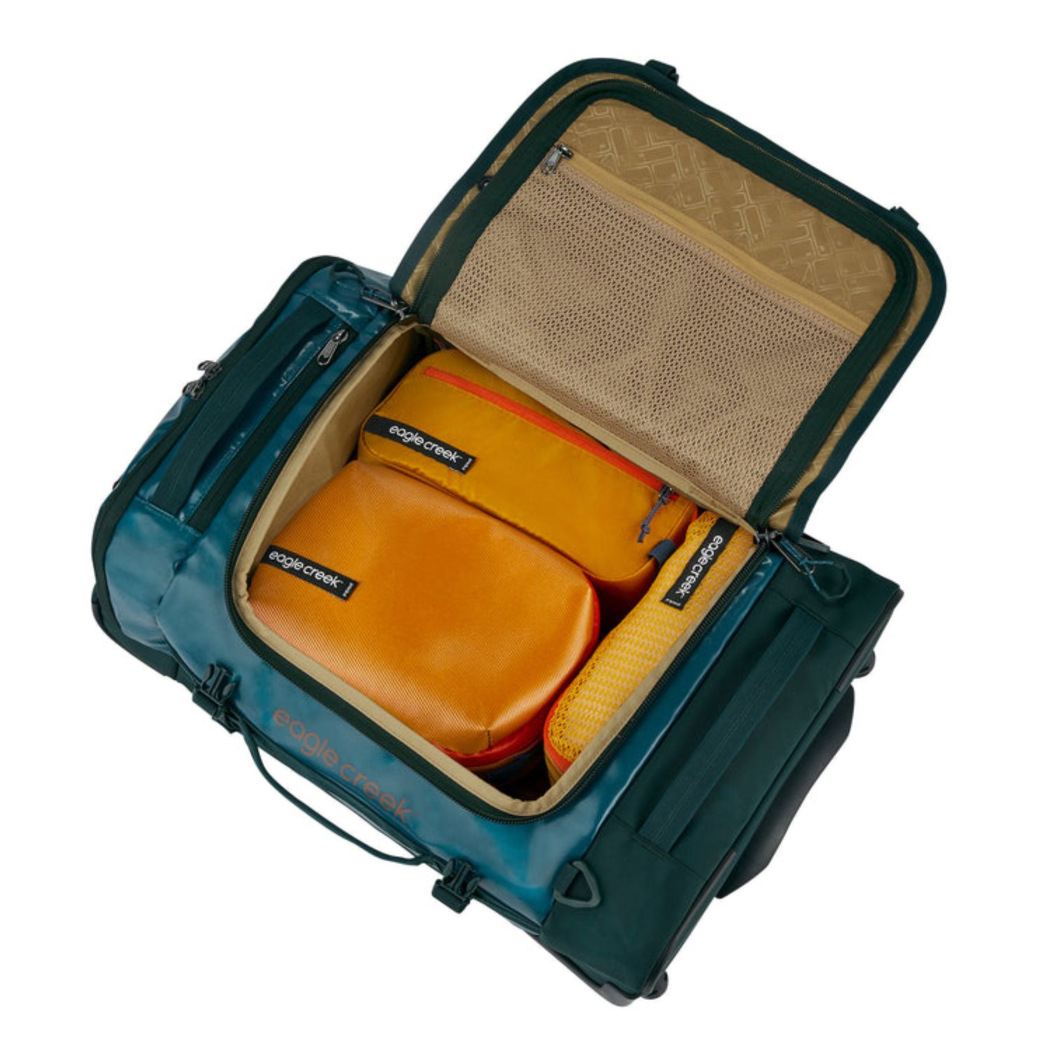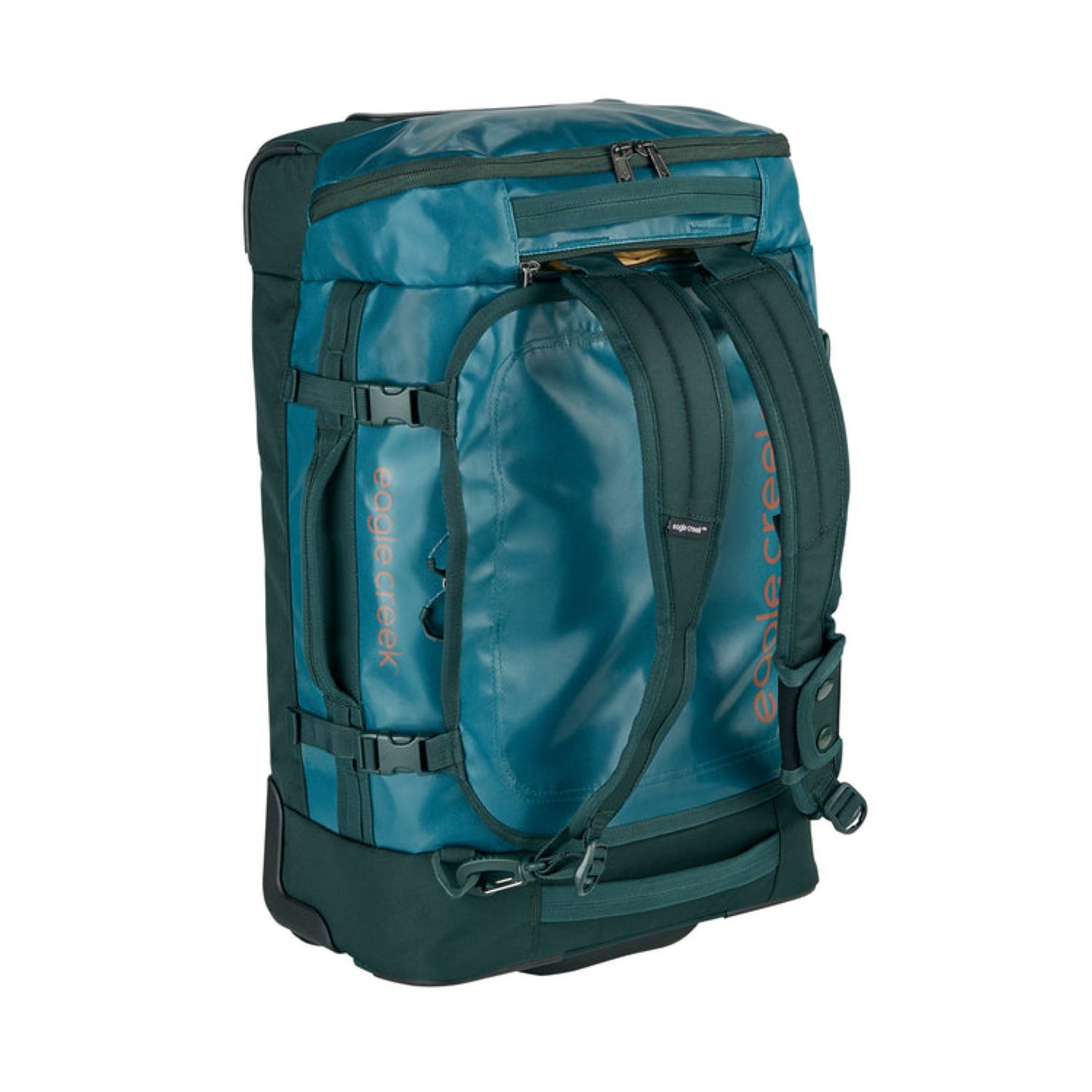 FEATURES - Rugged grab handles, large off-road wheels and handy tuck-away backpack straps make it easy to carry three different ways - Reinforced with durable corner guards for extra protection against damage from drags and drops - Reflective zipper pull loops were designed to give you ease of access to what?s inside, even when wearing gloves - Covered by Eagle Creek?s No Matter What? Warranty - Telescoping handle enhances ease of mobility when rolling the duffel - U-shaped zippered opening with interior mesh pocket is protected by a storm flap shield for extra water resistance - Internal compression straps keep your gear secure and in place - Water repellent 600D Poly TPU provides maximum durability and gear protection when you can?t predict the weather - Secure a travel lock through #10 lockable zippers and Central Lock Point to keep your gear protected - Fill the roomy main compartment with Eagle Creek?s Pack-It? System to stay organized and maximize space - Top accessory pocket includes an extra zippered mesh pocket with key clip for those easy-to-misplace items - Heavy duty compression straps and 8 lash points give you the ability to strap gear to your duffel