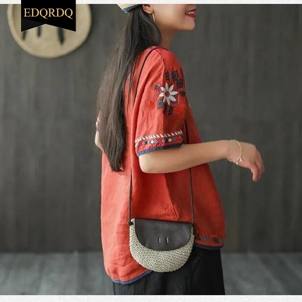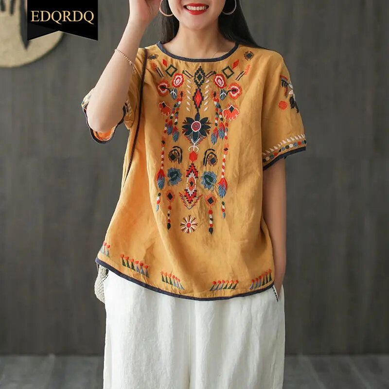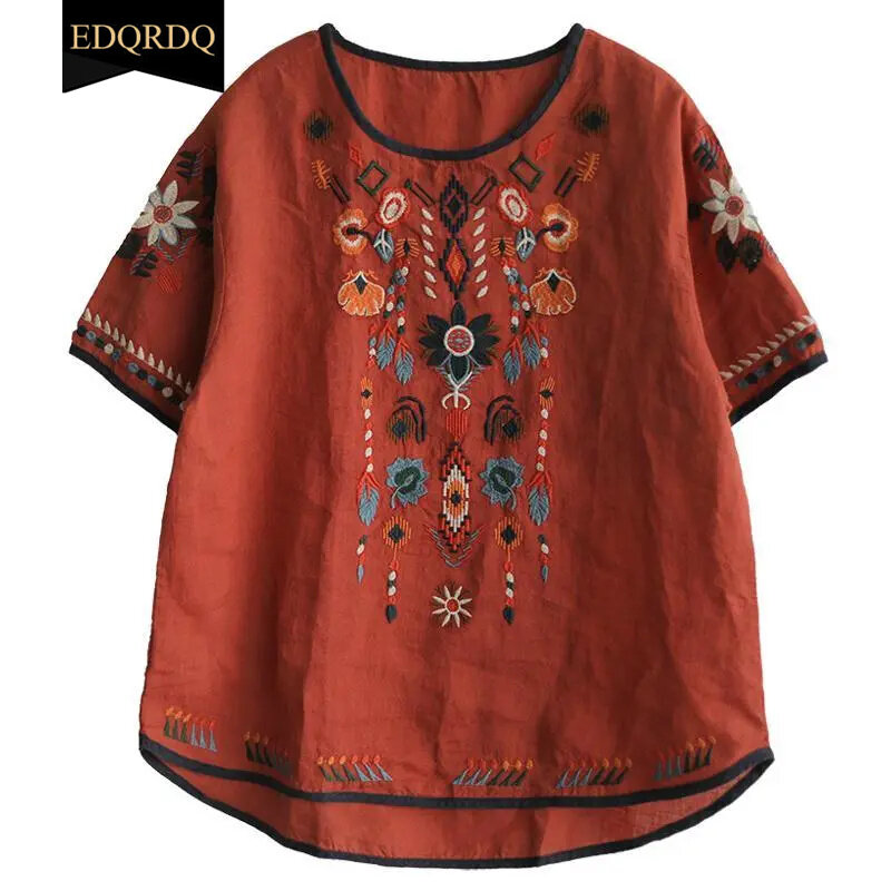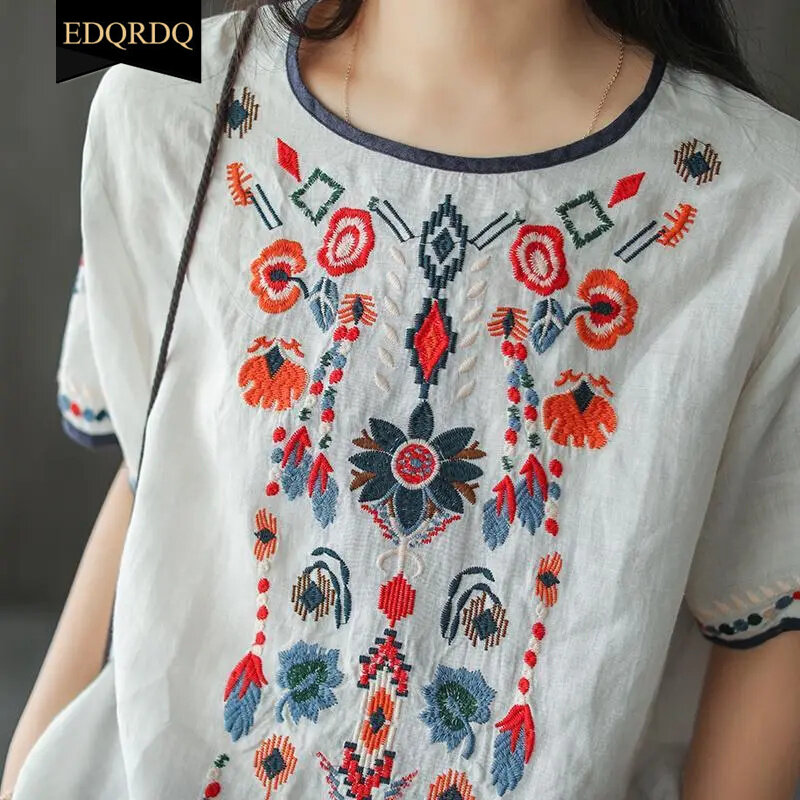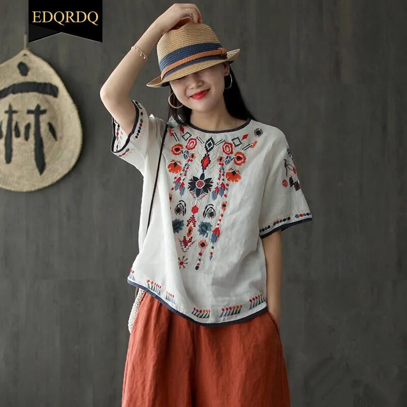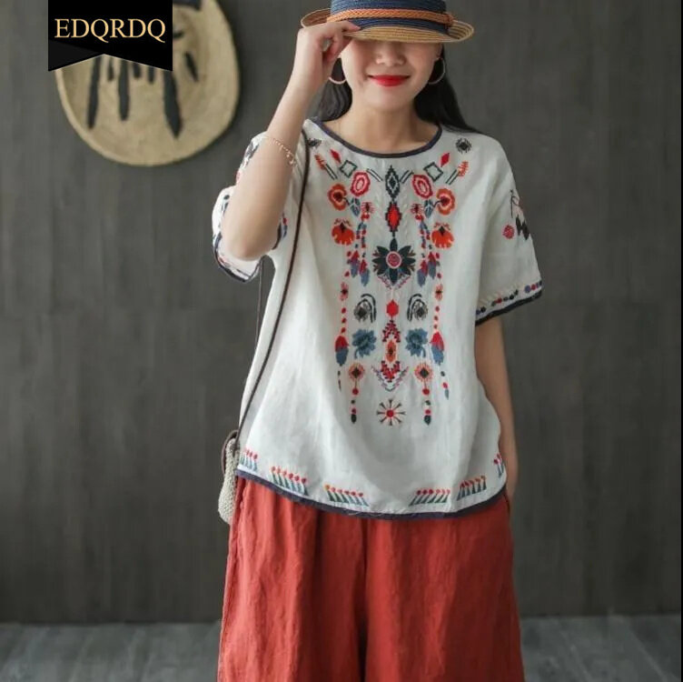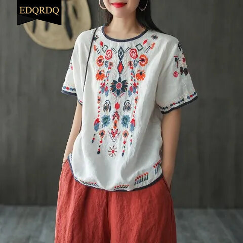 EDQRDQ Women's Embroidered Blouse Cotton Linen Short Sleeve Peasant Boho Mexican Tunic Top Casual T Shirt