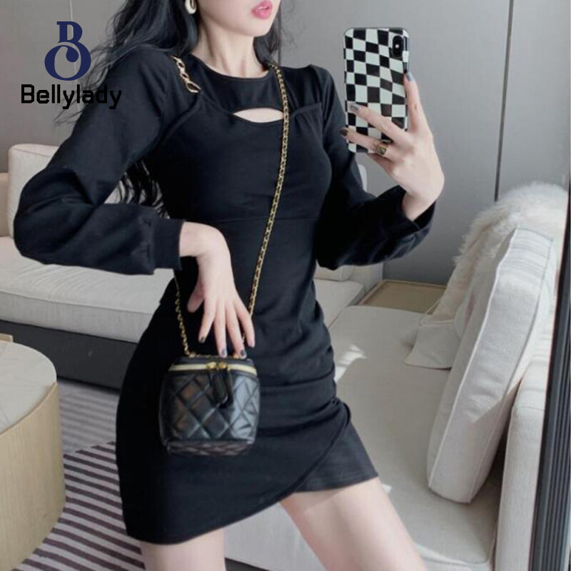 BellyLady Women Long Sleeves Sexy Bodycon Dress Cut Out High Waist Solid Color Round Neck Dress