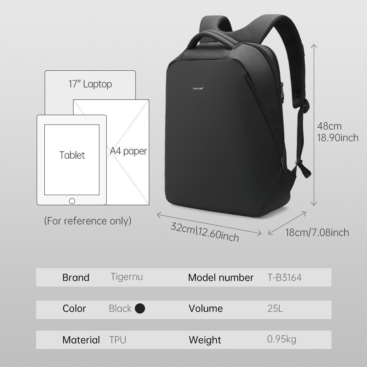 4. 25L large capacity design & Muti-functional pockets: main compartment, independent 17 inch laptop compartment and front zipper pocket ;