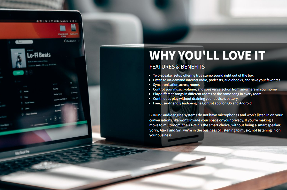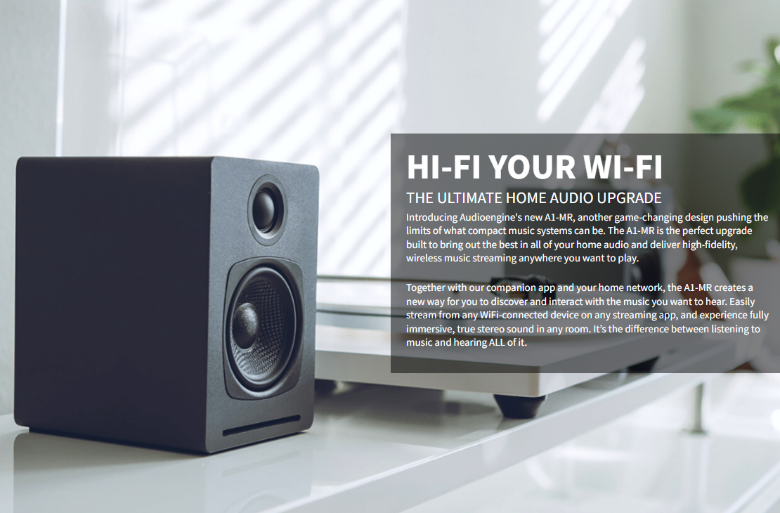 > Introducing Audioengine's new A1-MR, another game-changing design pushing the limits of what compact music systems can be. The A1-MR is the perfect upgrade built to bring out the best in all of your home audio and deliver high-fidelity, wireless music streaming anywhere you want to play.