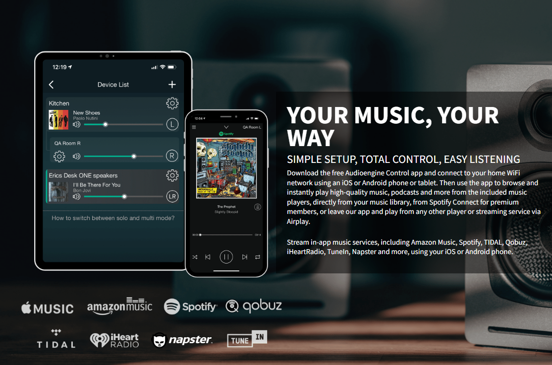 > Download the free Audioengine Control app and connect to your home WiFi network using an iOS or Android phone or tablet. Then use the app to browse and instantly play high-quality music, podcasts and more from the included music players, directly from your music library, from Spotify Connect for premium members, or leave our app and play from any other player or streaming service via Airplay.