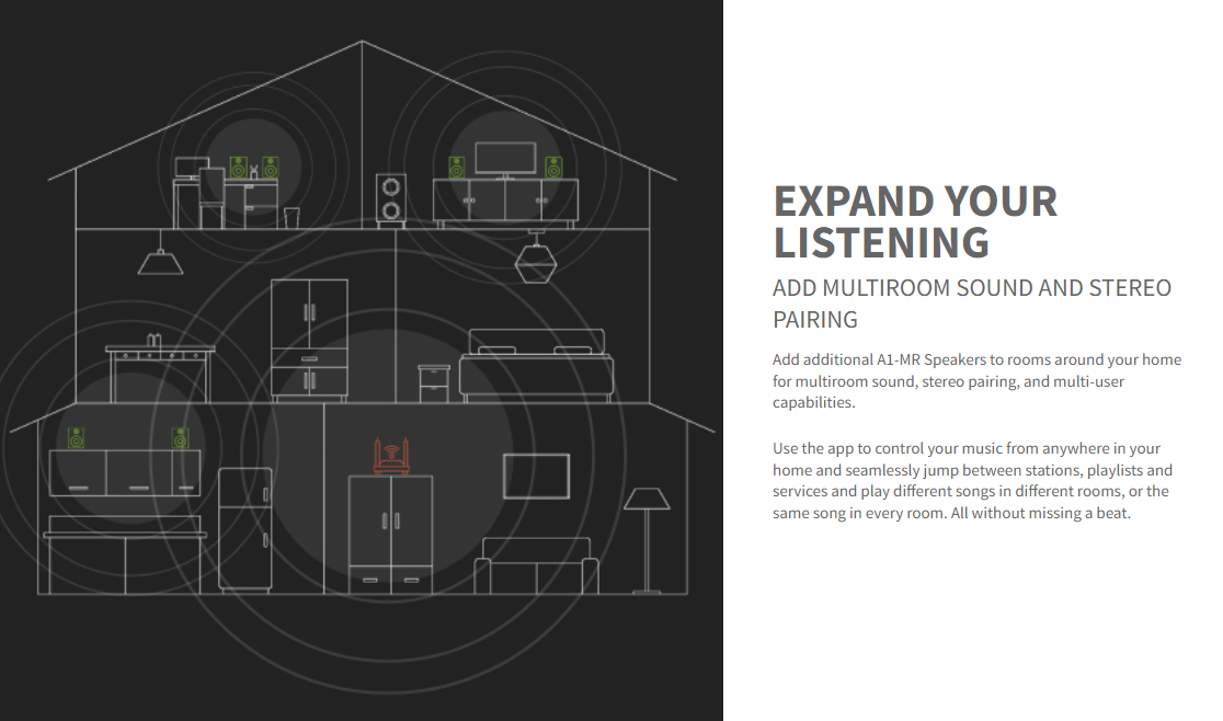> Together with our companion app and your home network, the A1-MR creates a new way for you to discover and interact with the music you want to hear. Easily stream from any WiFi-connected device on any streaming app, and experience fully immersive, true stereo sound in any room. It’s the difference between listening to music and hearing ALL of it.