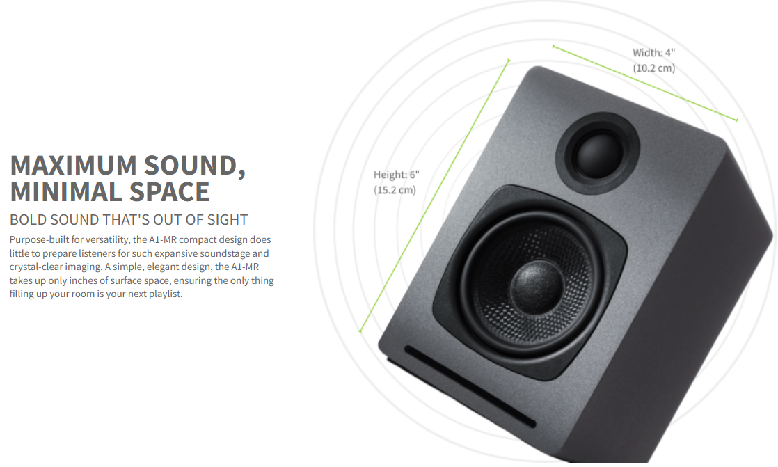 > Purpose-built for versatility, the A1-MR compact design does little to prepare listeners for such expansive soundstage and crystal-clear imaging. A simple, elegant design, the A1-MR takes up only inches of surface space, ensuring the only thing filling up your room is your next playlist.