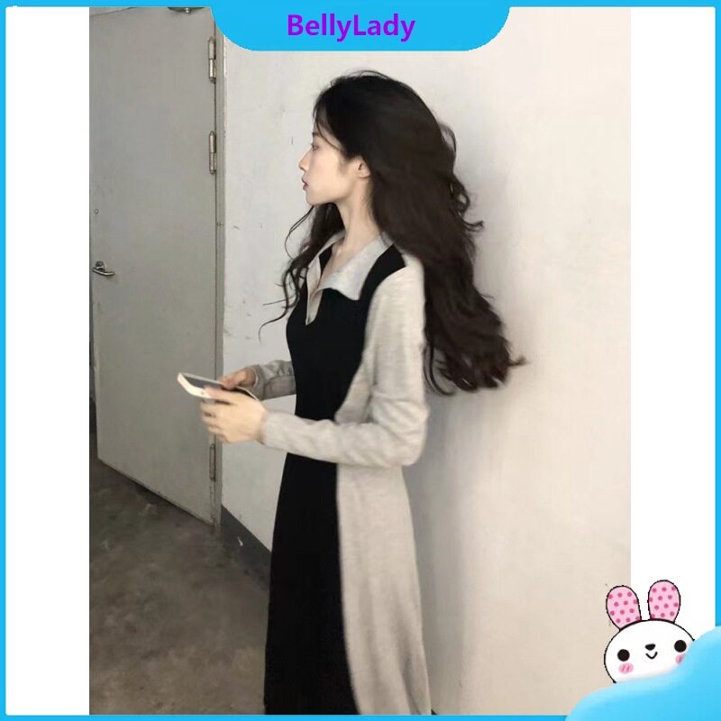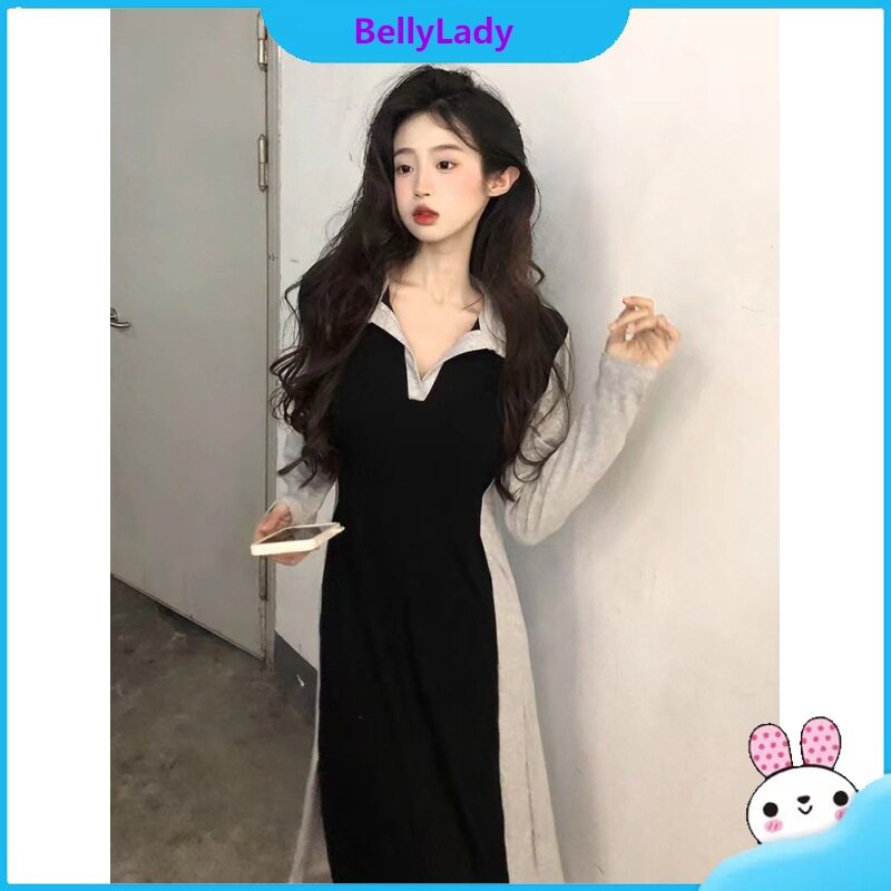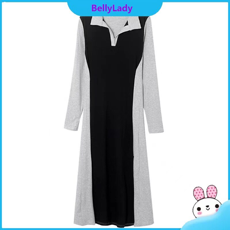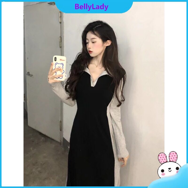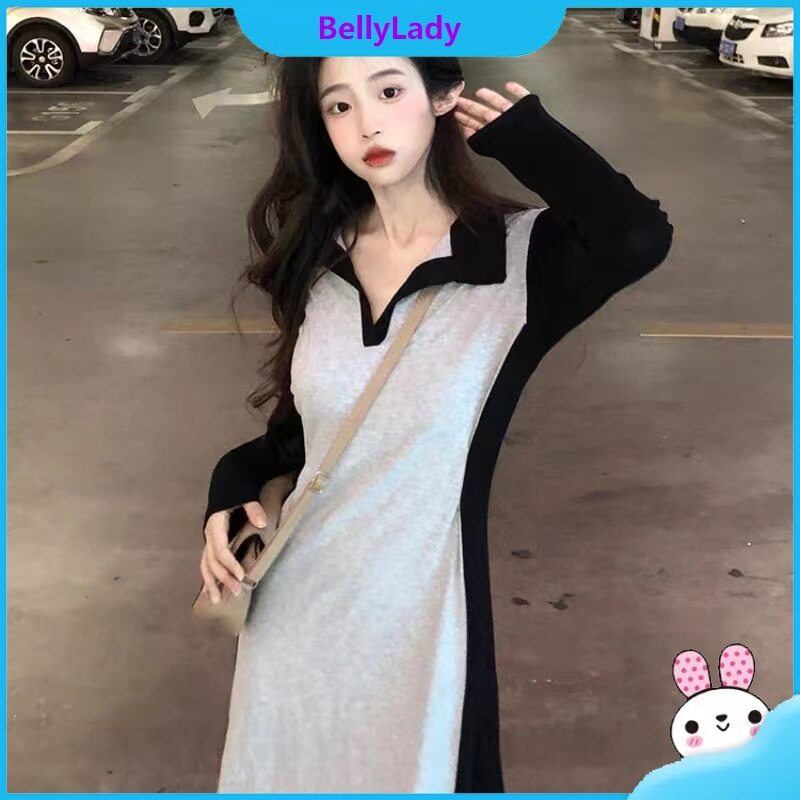 Women V Neck Dress Trendy Contrast Color Long Sleeves A-line Skirt Casual Elegant High Waist Slimming Dress