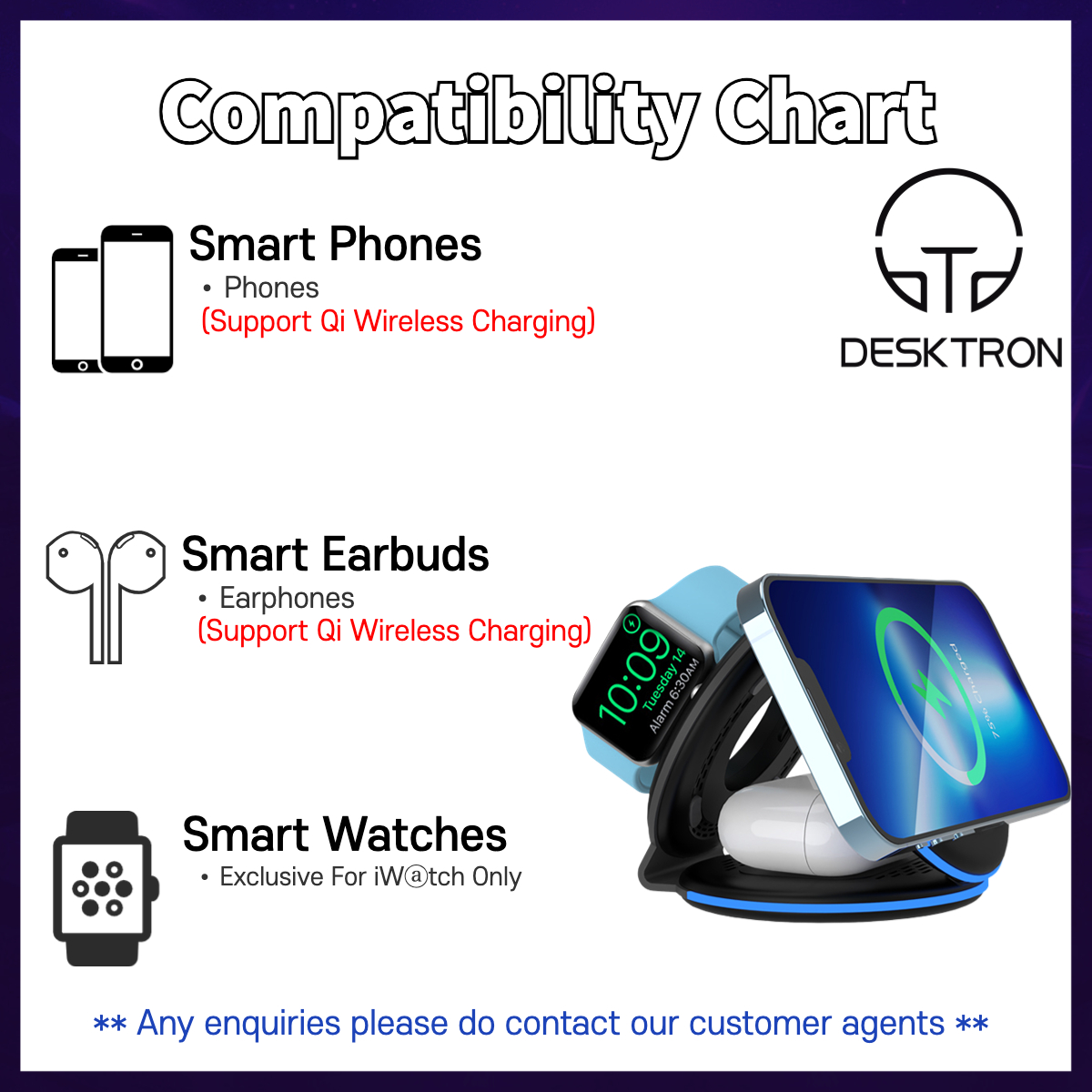 DESKTRON Magnetic 3 in 1 Wireless Phone Charger, 15W Qi Fast Charger, Magnetic Foldable Qi Fast Wireless Charging Station Compatible iPhone 14 Androids iWatch and AirPods.