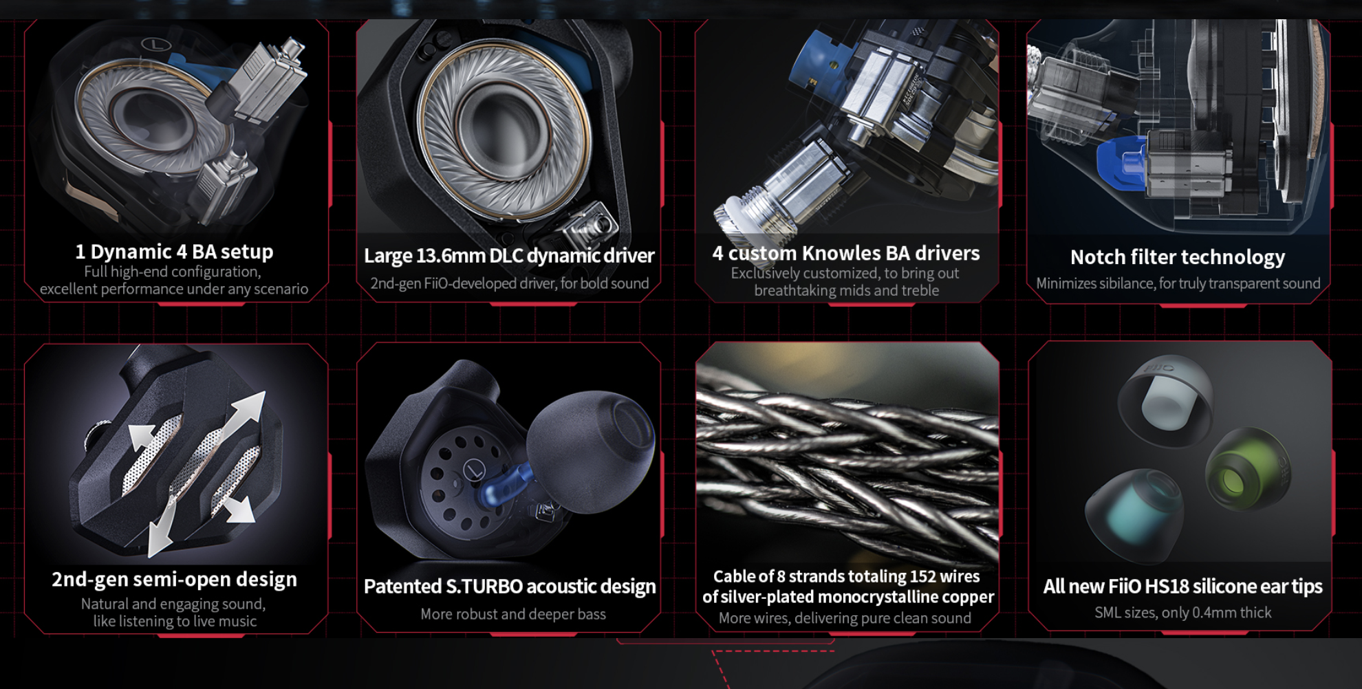 FiiO’s latest FH7S packs a powerful performance with its precisely designed driver configuration. The pair houses a five-driver hybrid configuration featuring a 13.6mm custom-developed DLC Diaphragm dynamic driver unit. This dd unit is paired with four customised balanced armature drivers from Knowles.