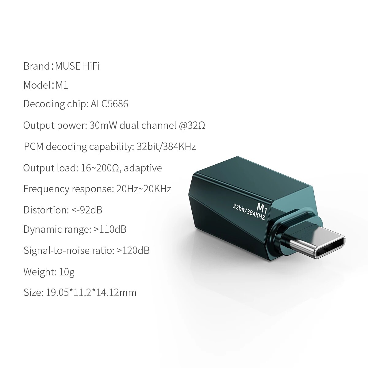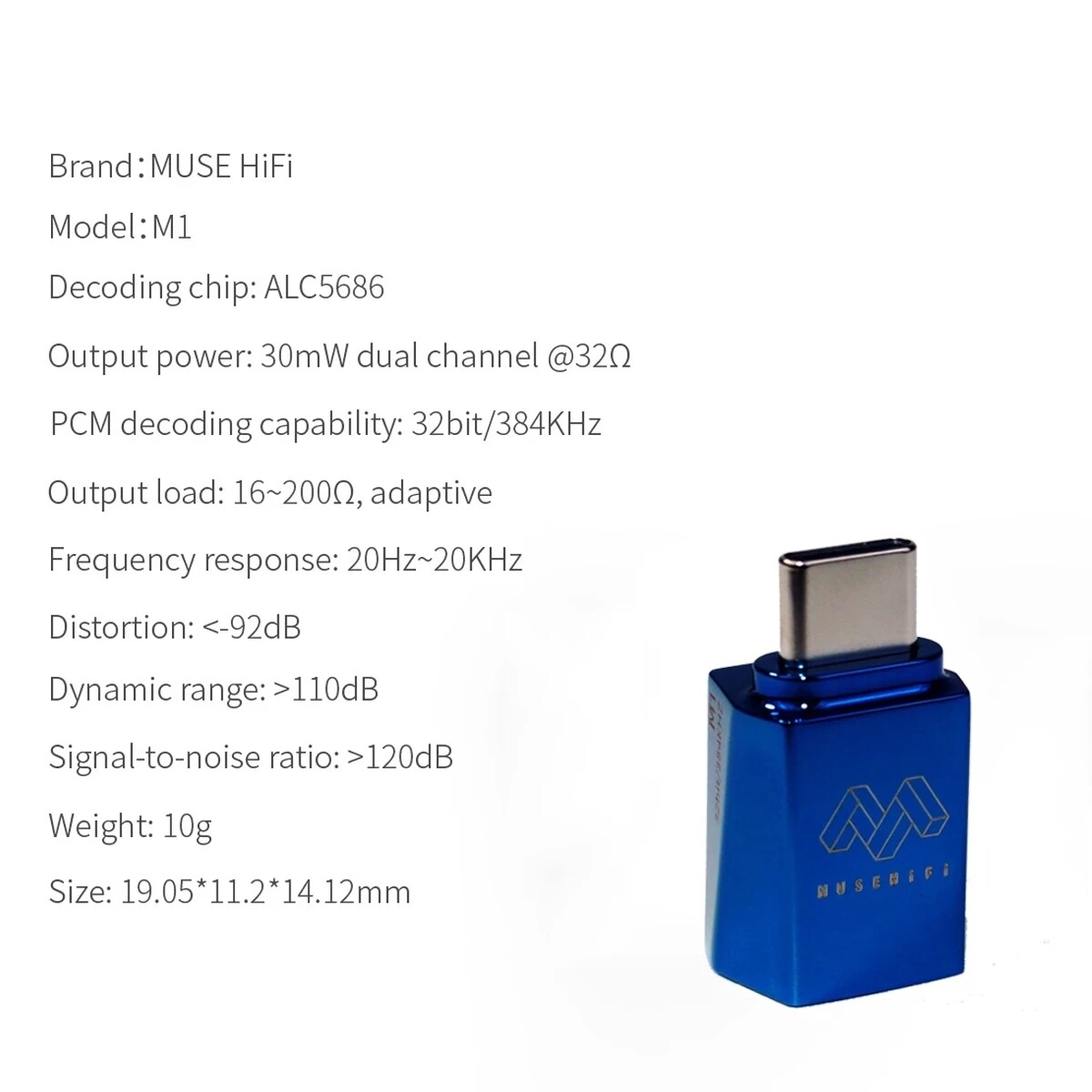 Brand:MUSE HiFi Model:M1 Decoding chip: ALC5686 Output power: 30mW dual channel @32Ω PCM decoding capability: 32bit/384KHz Output load: 16~200Ω, adaptive Frequency response: 20Hz~ 20KHz Distortion: <-92dB Dynamic range: >110dB Signal-to-noise ratio: >120dB Weight: 10g Size: 19.05*11.2*14.12mm