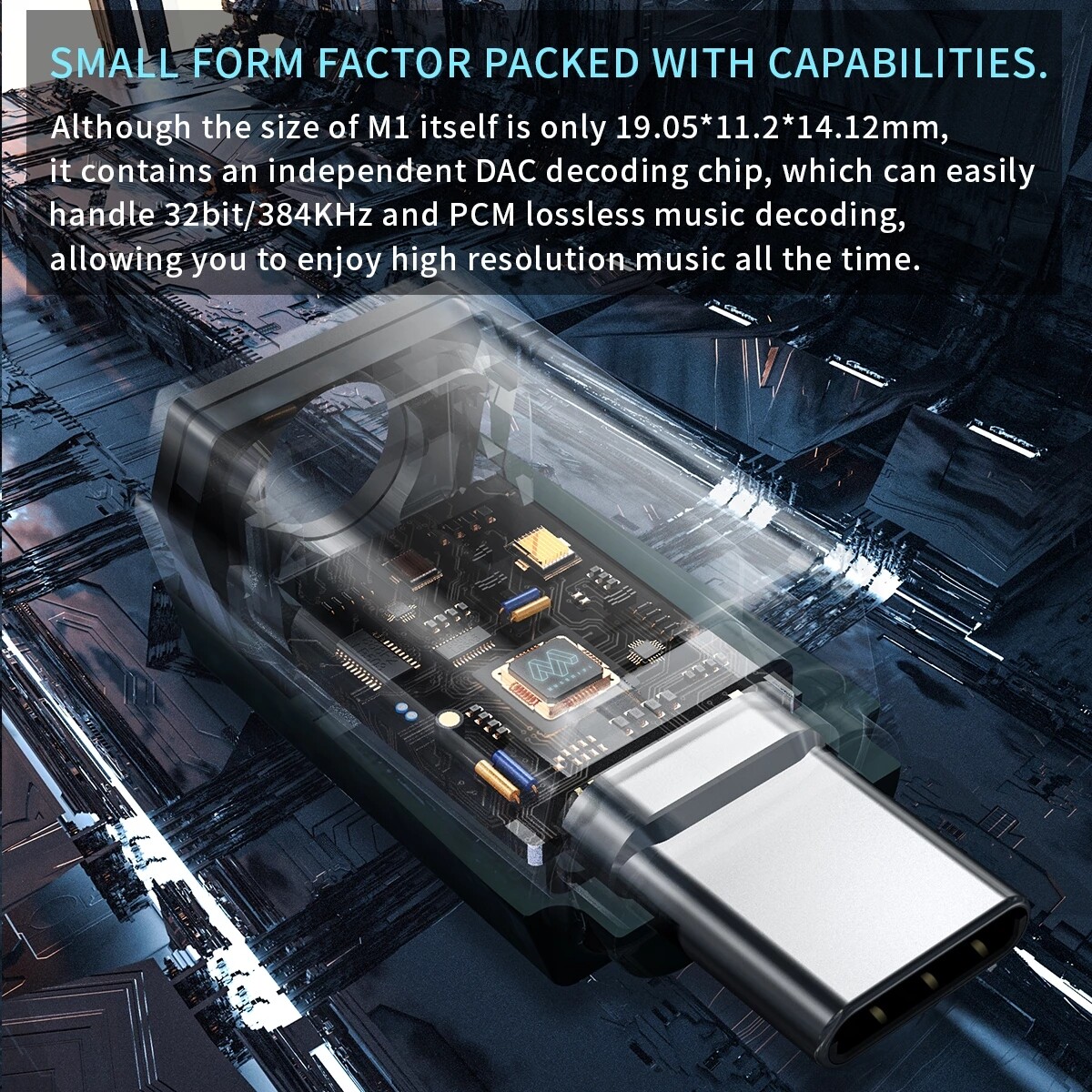 Although thesize of M1 itself is only 19.05*11.2* 14.12mm,it contains an independent DAC decoding chip, which can easily handle 32bit/384KHz and PCM lossless music decoding,allowing you to enjoy high resolution music all the time.