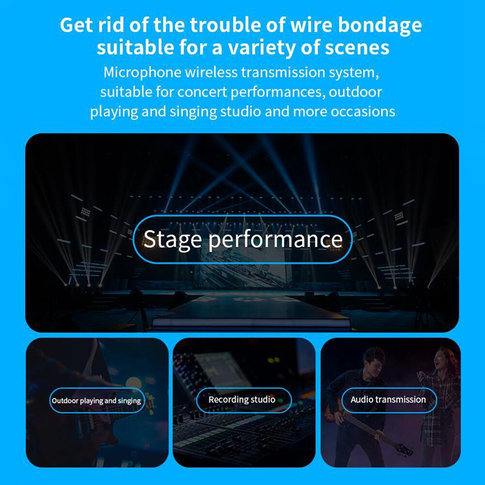 Feature: 1. Advantages and Scenarios: The microphone wireless transceiver solves the wireless audio signal transmission between the microphone and the audio, the mixer, and the sound card, realizing the expansion effect of wireless audio transmission, and solving the traditional wiring mode. This product is suitable for stage performances, outdoor entertainment, speeches, outdoor performances, and other places