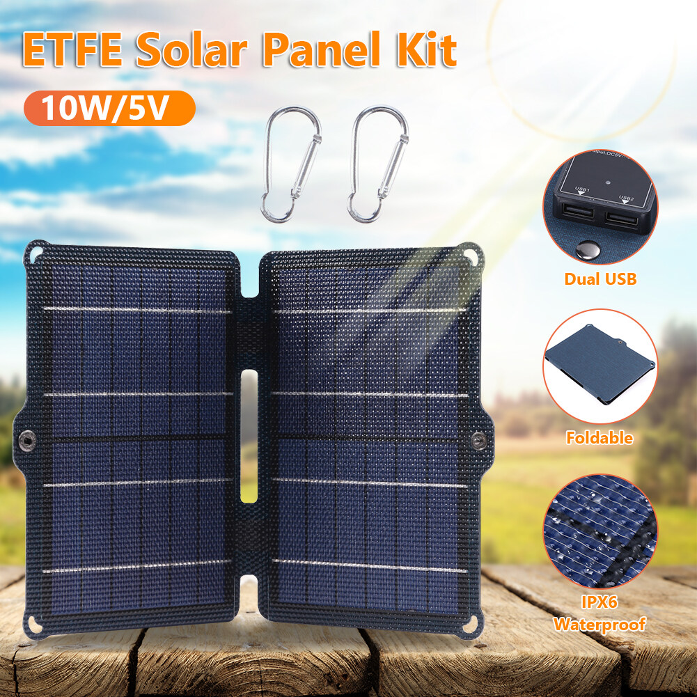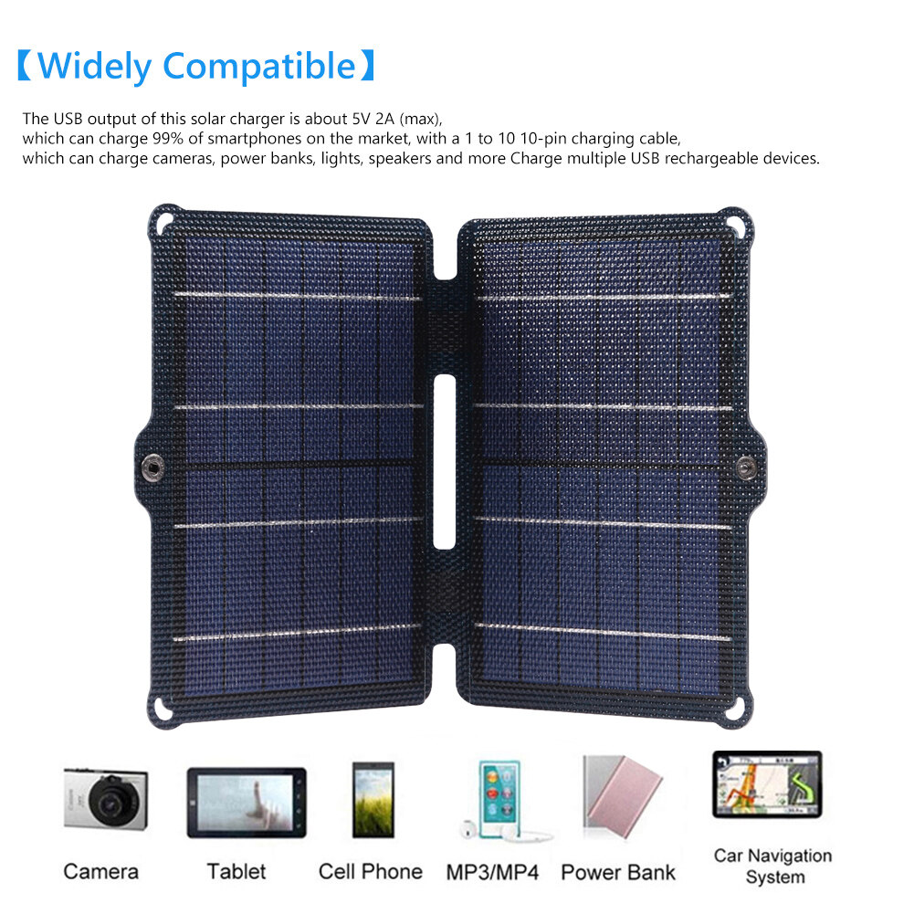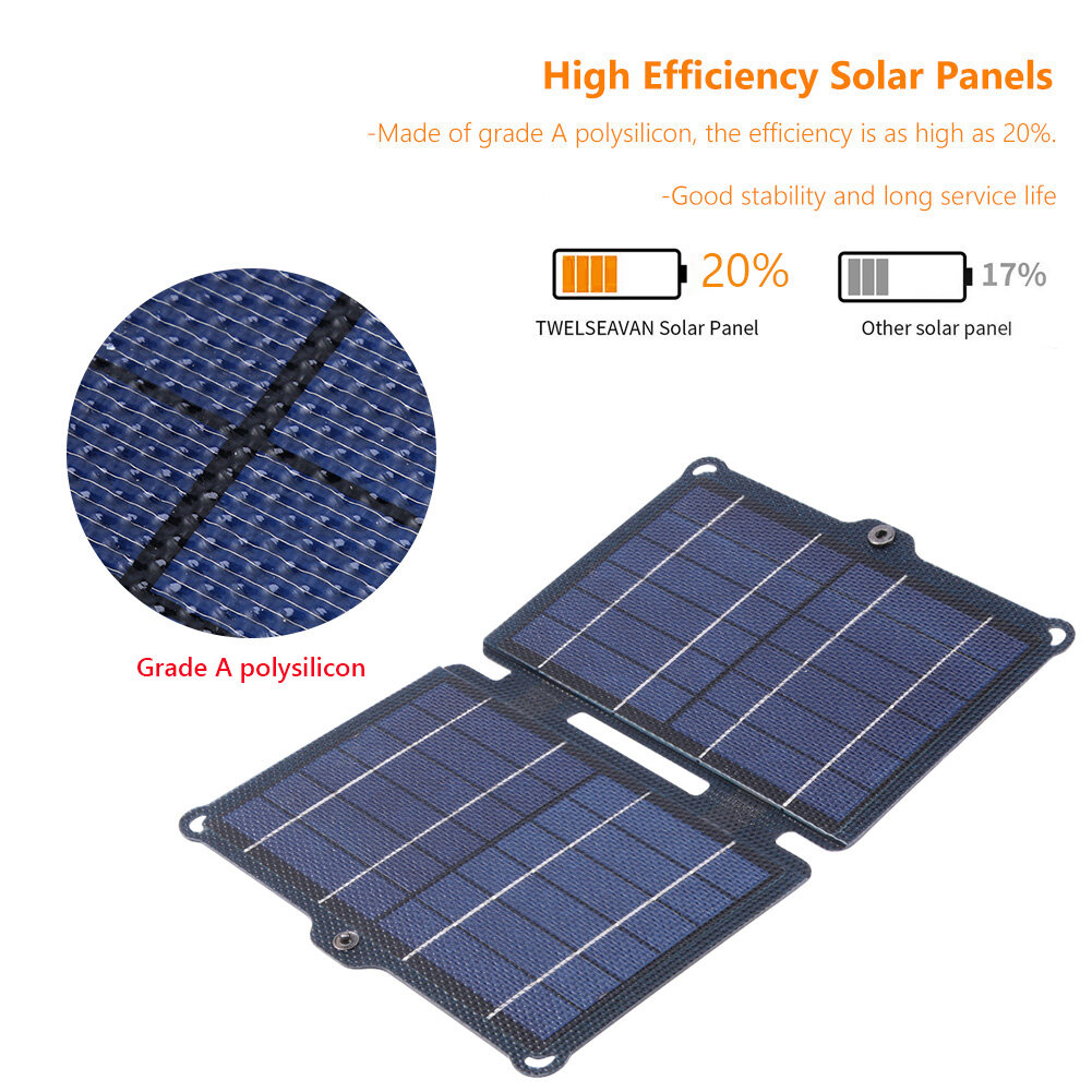 Feature: 1. High Efficiency Solar Panel: This 10W solar charger is made of A-grade polycrystalline silicon solar panel with up to 20% efficiency. This means you'll get more power and faster charging in the same sunlight conditions.