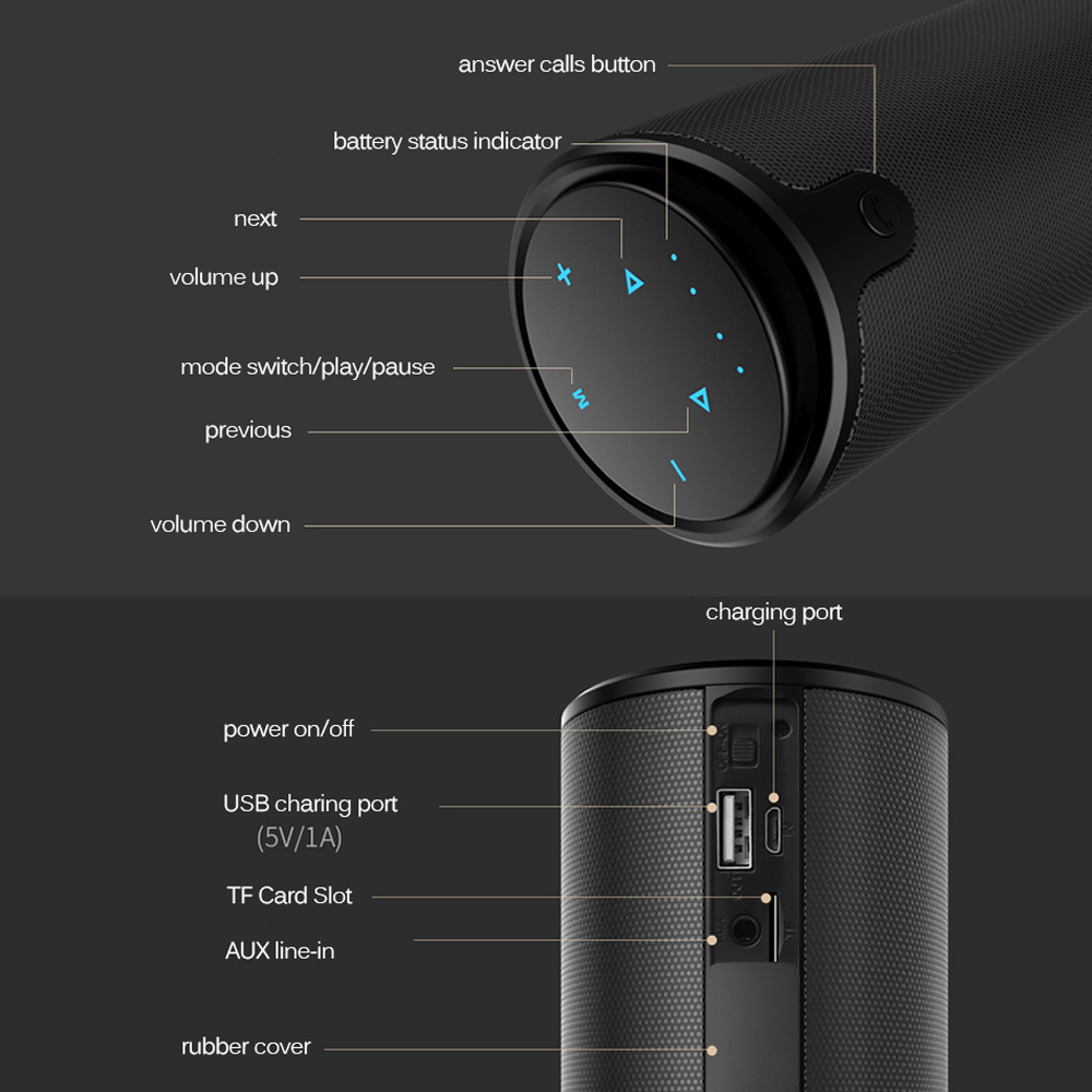4). Support AUX Line-out Music Play Mode, USe A Standard 3.5mm Audio Cable Connect The Speaker To Mobile Phone Or Tablet PC To Play Music even when your devices without bluetooth function, can be used as a wired speaker.