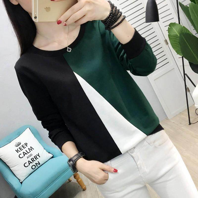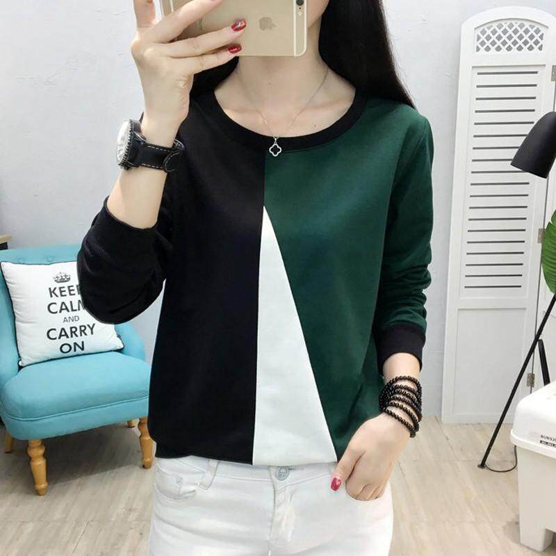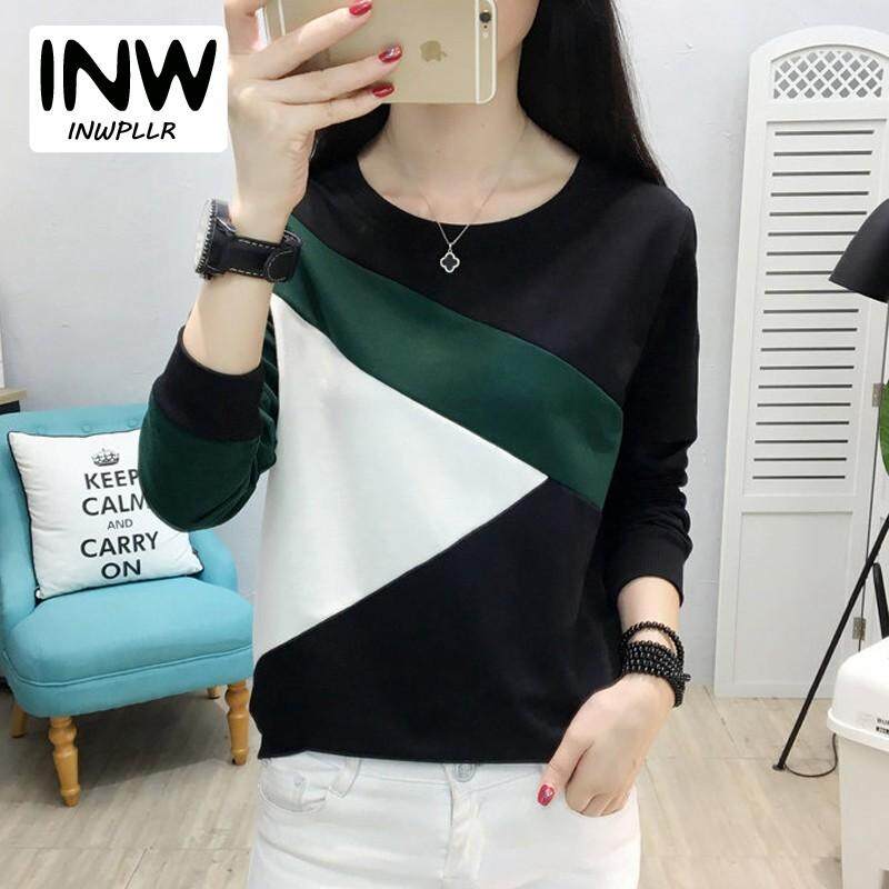 INWPLLR Korean Style Fashion Women T-shirts Autumn Patchwork Tshirts Casual Cotton Tshirts Female Tops Tees Plus Size Long Sleeve T-Shirt