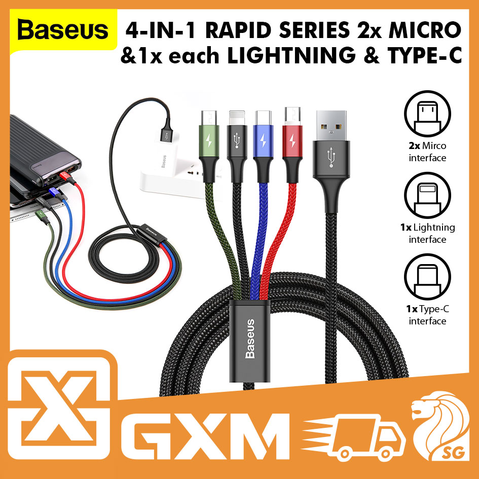 Baseus Rapid 4 In 1 iPhone Lightning Type-C Micro USB Multiple Charging Cable 3.5A Simultaneous Charge IOS Android 1.2M Data Sync Cable