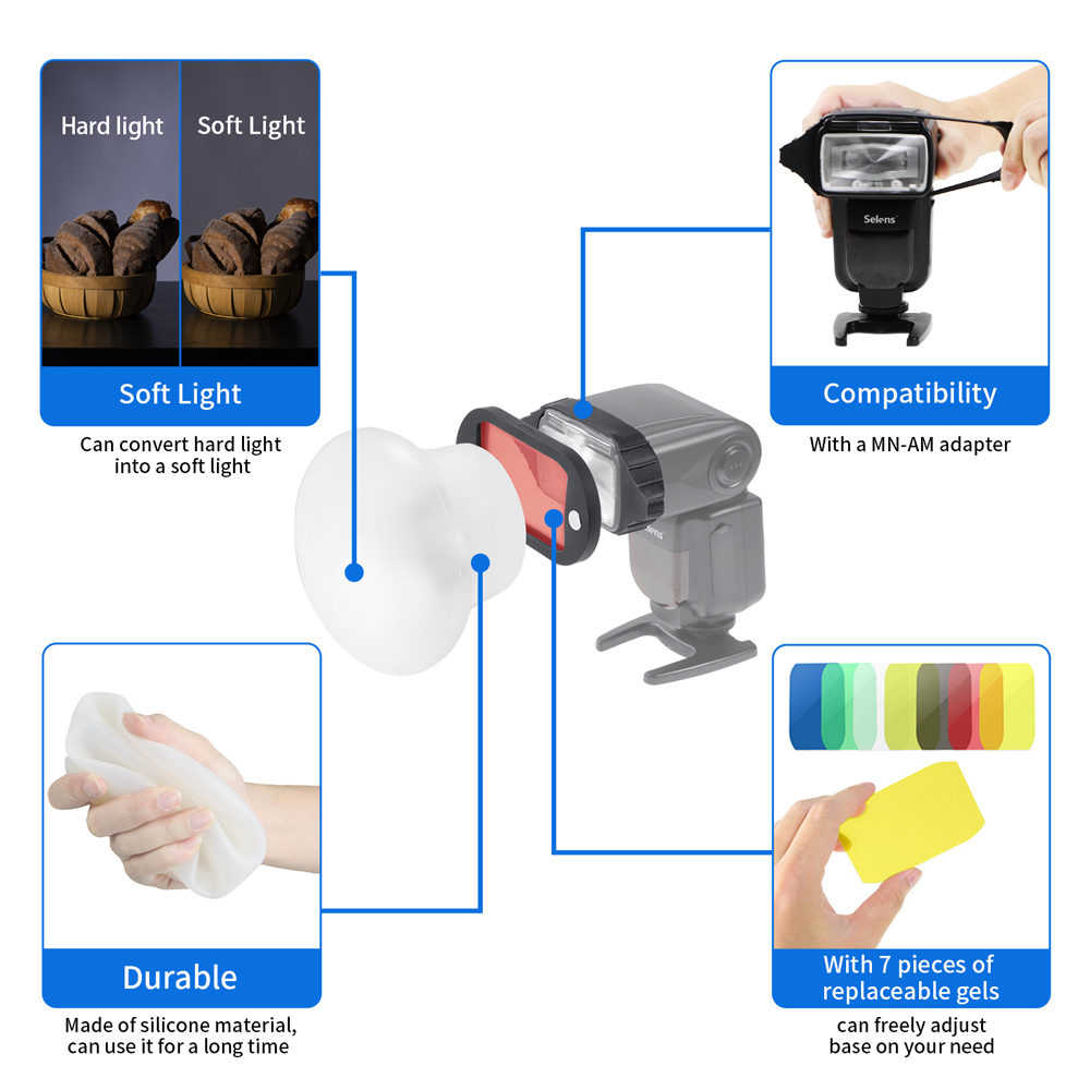Durable semi-transparent silicone material that withstands the high temperatures and allows your flash to easily pass through